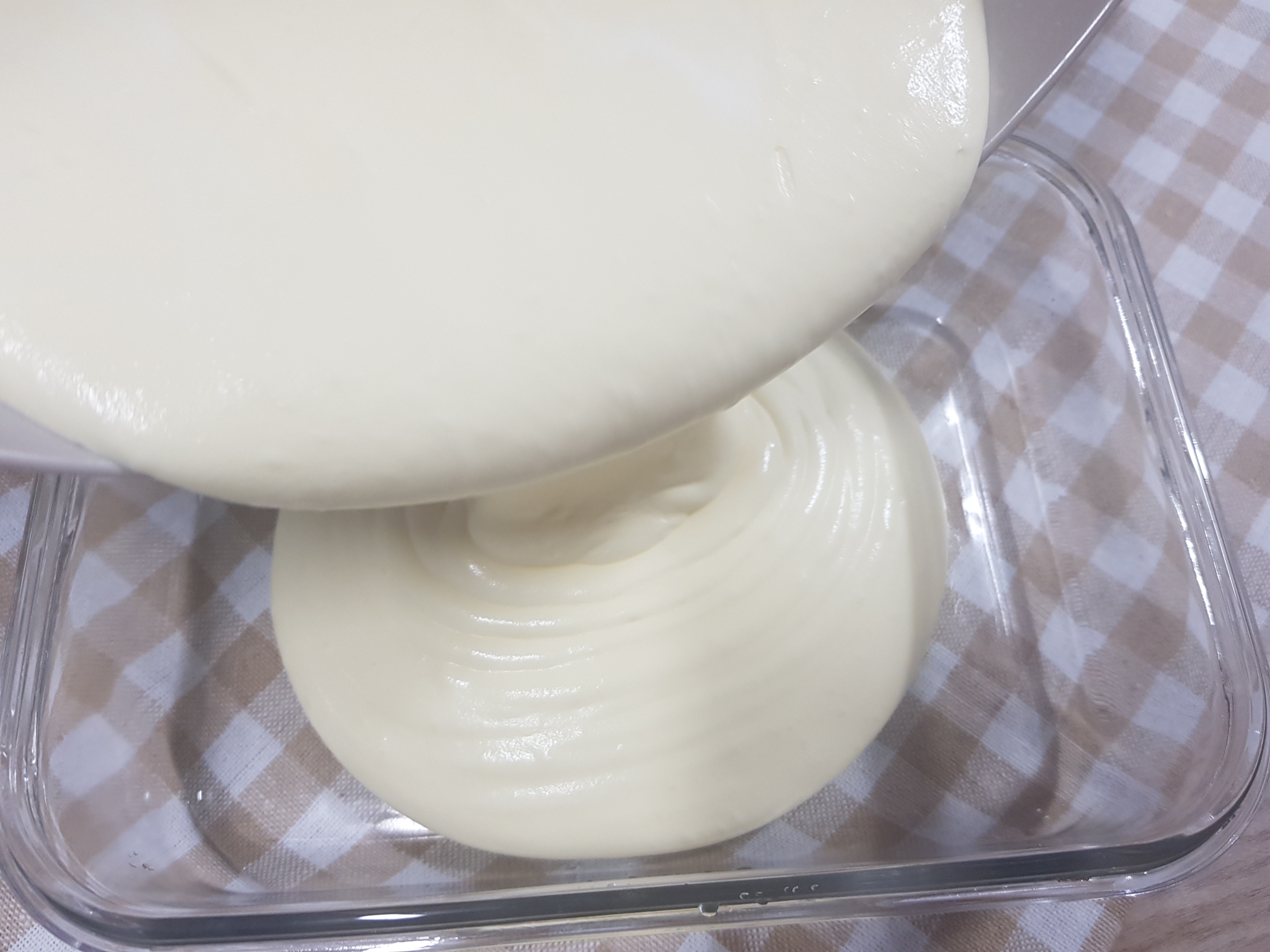 이제 냉동실행 들어가기 전에 적당한 용기에 넣어준다. 이 아이스크림은 보통 아이스크림 집에서 만들때 시간마다 꺼내서 포크로 뒤적뒤적 안해줘도 된다고 함.