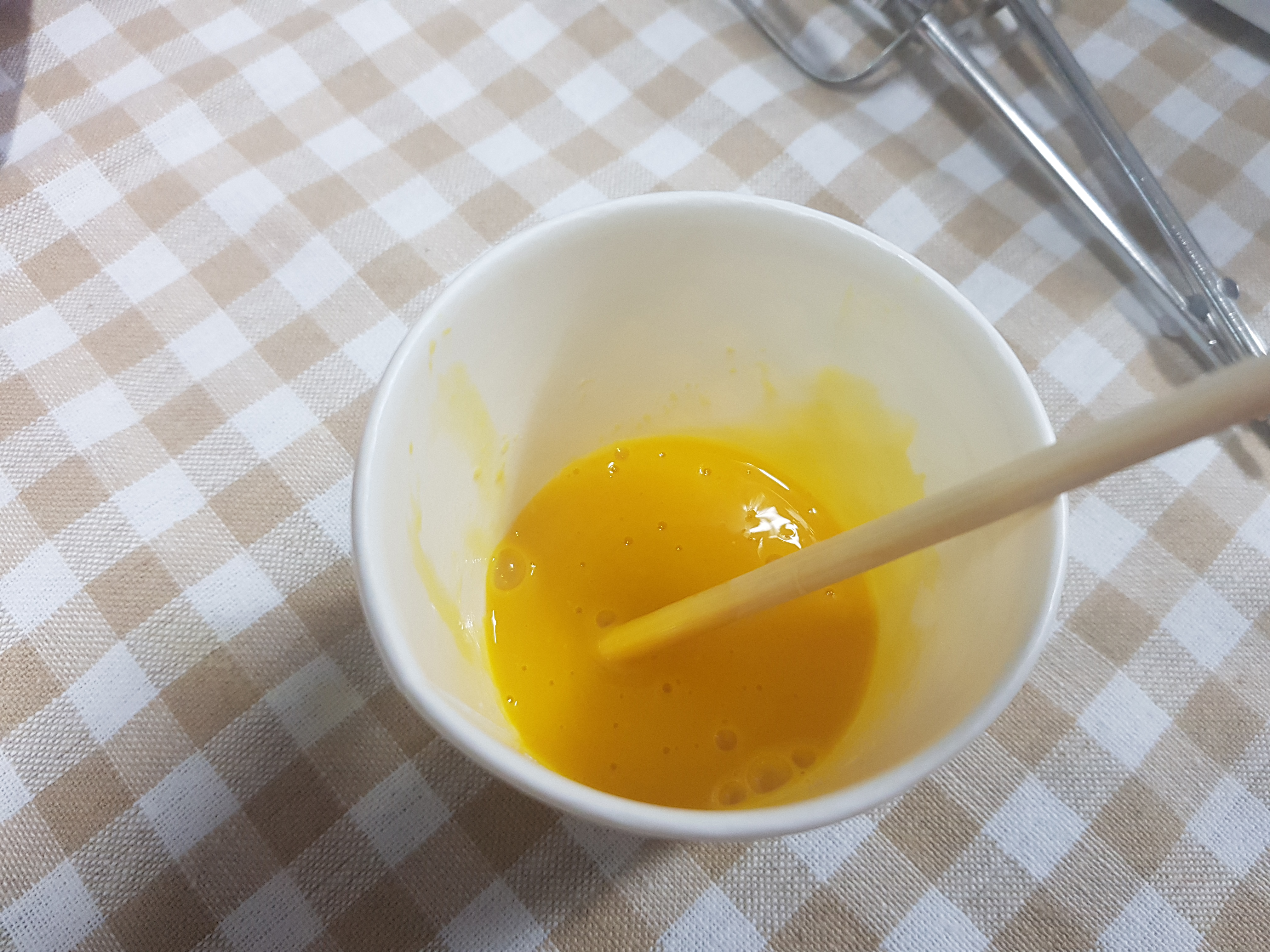골고루 섞어준다. 섞일정도로만. 노른자가 안들어가도 되지만 맛도 부드러움도 노른자가 들어간게 훨 맛있다고 함.