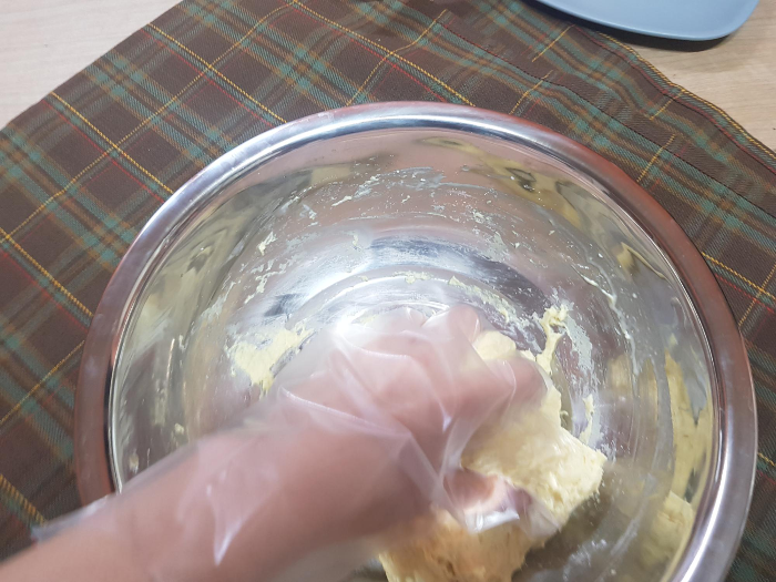 이제 비닐장갑 끼고 반죽을 좀 귀찮게 치대준다ㅋㅋ확실히 찹쌀이라 쫜득쫜득 잘 달라붙는다.ㅋㅋ그래서 덜붙으라고 라텍스 장갑끼고 다시했는데 더 잘붙어서 포기.비닐장갑 우승. 참고로 귀찮아서 식용유를 장갑에 바르지 않았다.ㅋ