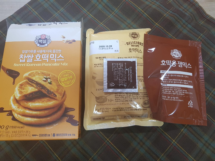뜯어보면 두가지가 들어있는데 왼쪽은 호떡믹스 위에 업힌애는 이스트 되시겠다.오른쪽엔 호떡안에 고이 넣는 하일라이트.설탕이 들어있다.가격은 4천원 미만이었던거 같다.다른거랑 같이사서..아마 그정도로 추측 설겆이 거리를 줄이기 위해 담아두는건 생략한다.최소한만ㅋㅋ