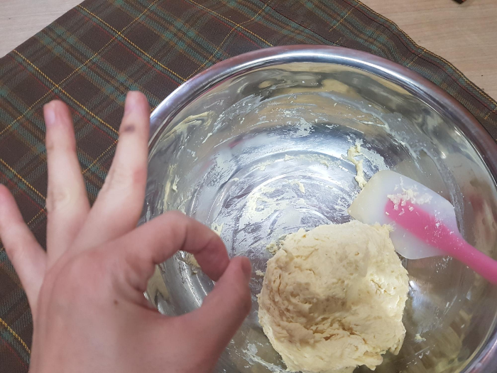 섞다보면 이렇게 덩어리가 됨 뭔가 찹쌀이라 그런지 밀가루랑 느낌이 다르다.