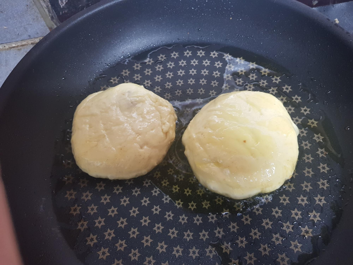 버터로하면 더 맛있지만 일단 나는 식용유를 후라이팬에 두르고 반죽을 올렸다. 불을 약하게 하고 눌러서 펴주고 모양을 잡아줬다. 왜? 난 입문자라서ㅋ