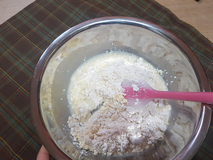 바로 호떡믹스를 부어주고 주걱으로 섞어준다 골고루 뒤집어가며