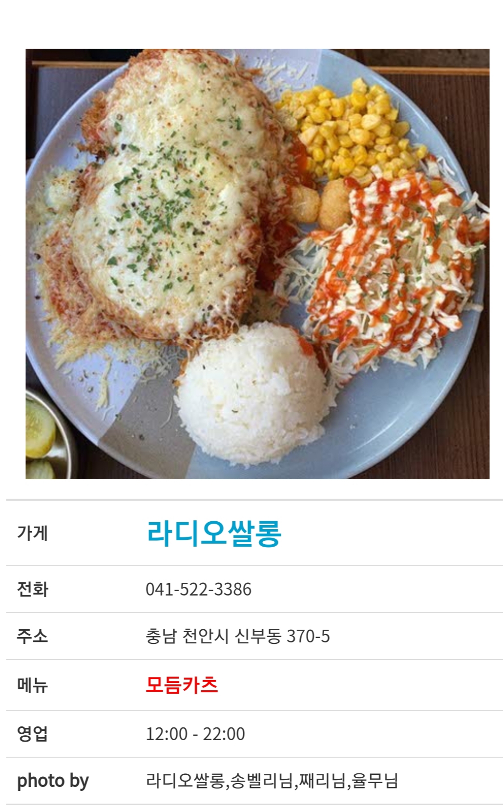 주소 : 충남 천안시 신부동 370-5 , 영업시간 : 매일 12 : 00 - 22 : 00 , 대표번호 041-522-3386