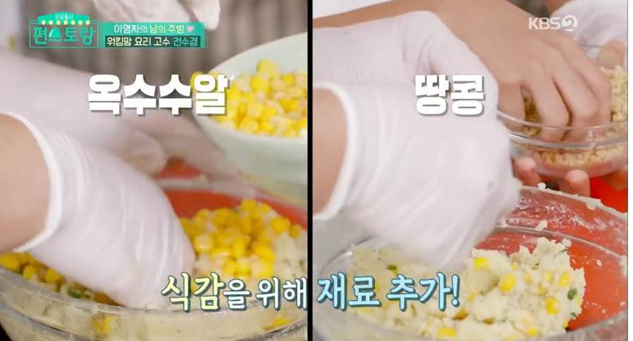 비주얼과 식감을 위해 옥수수알과 땅콩등의 재료들을 추가해준 편스토랑 이영자 드림포테이토 피자에 넣을 감자소 !