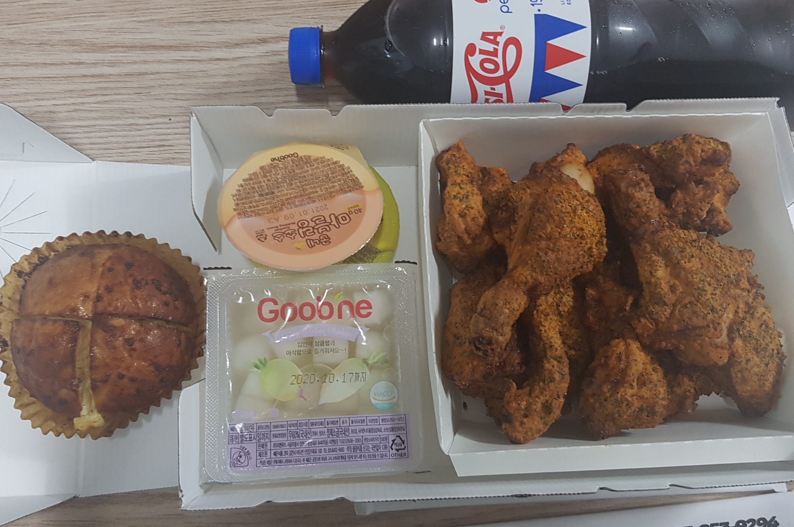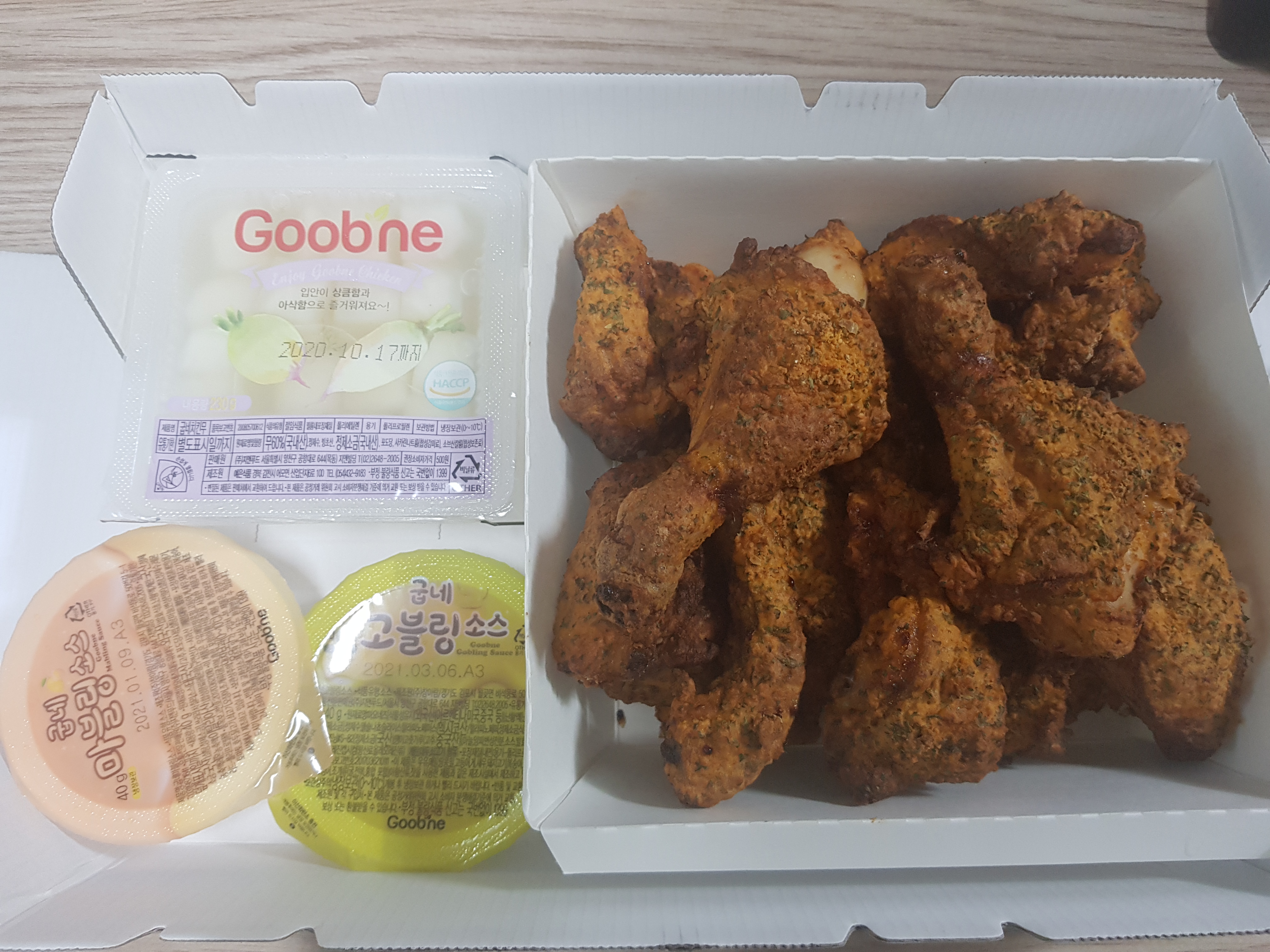 예쁘게 찍고 싶지만 ㅋㅋㅋ 똥손이라..ㅋㅋㅋ대충 펼쳐서 찍어봤음. 콜라와 고블링,마블링소스 치킨무, 바게트볼 갈릭크림 이렇게 구성되어있음. 비주얼부터 이미 담백하다.ㅋㅋ기름기 쫘악 빠진 메마른느낌 이랄까 ㅋㅋㅋ 바사삭해 보이기도 하고ㅋㅋ