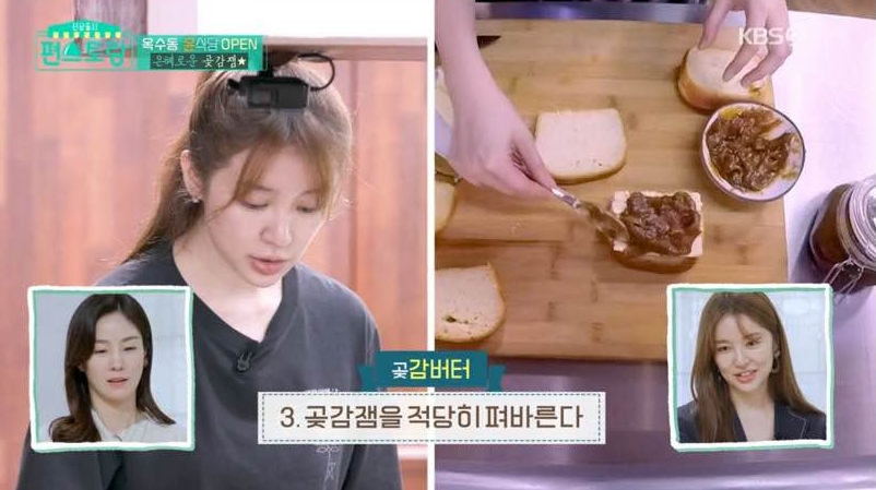 편스토랑 한글날 특집에서 지난주 주방 공개로 모두를 놀라게 한 윤은혜가 이번에는 즉석 아이디어로 곶감잼을 만들어 직접 만든 식빵에 앙버터처럼 감버터 빵을 만드는 장면이 나왔다.