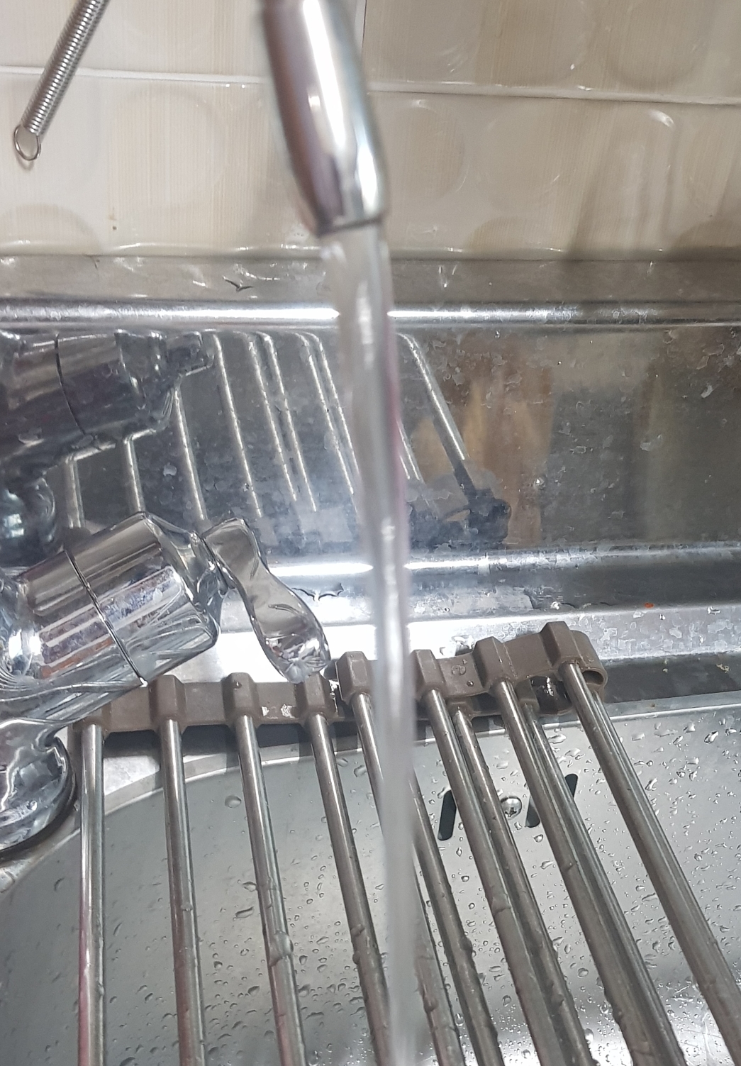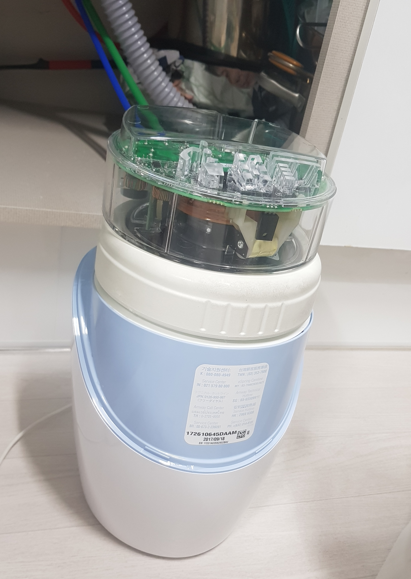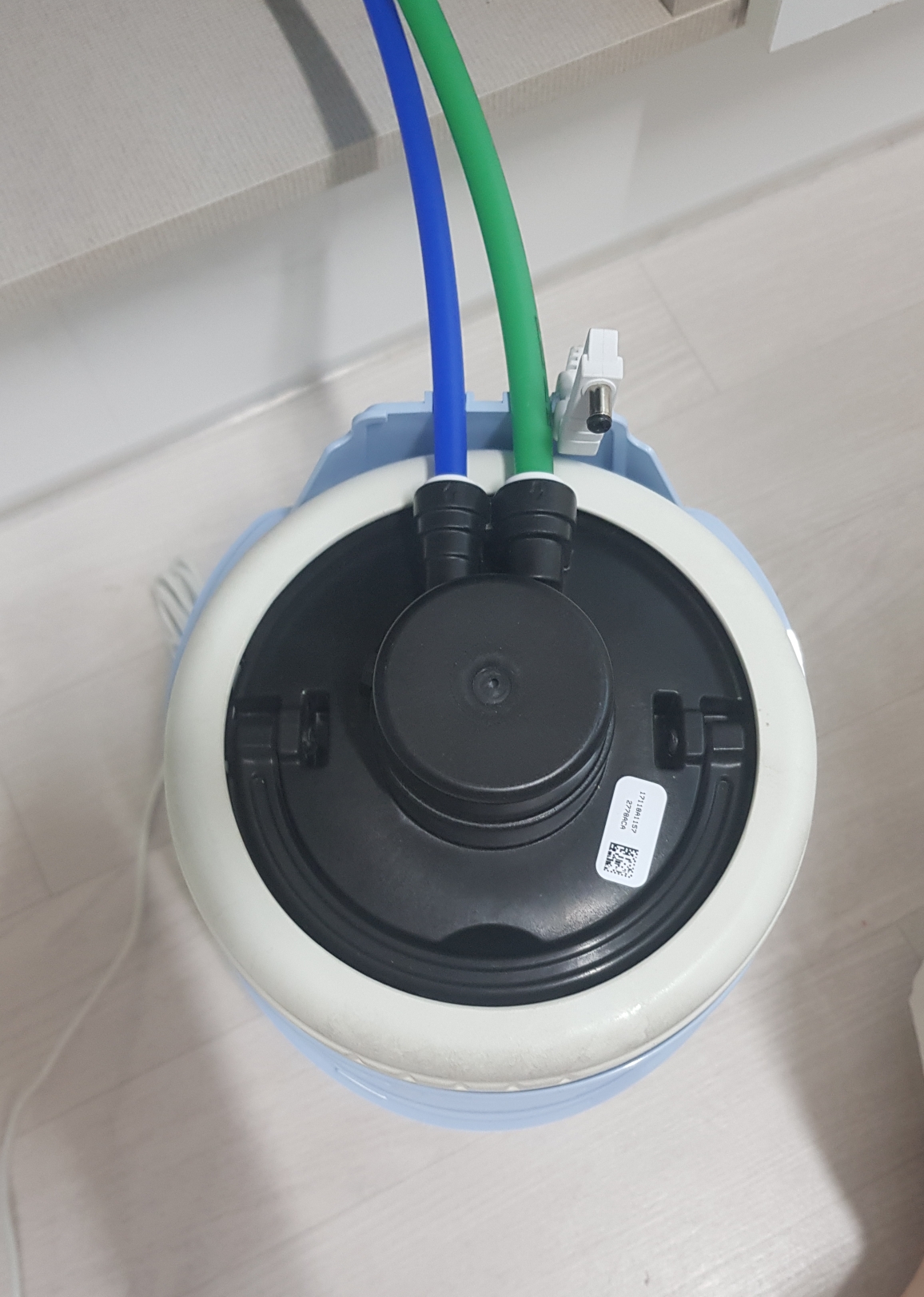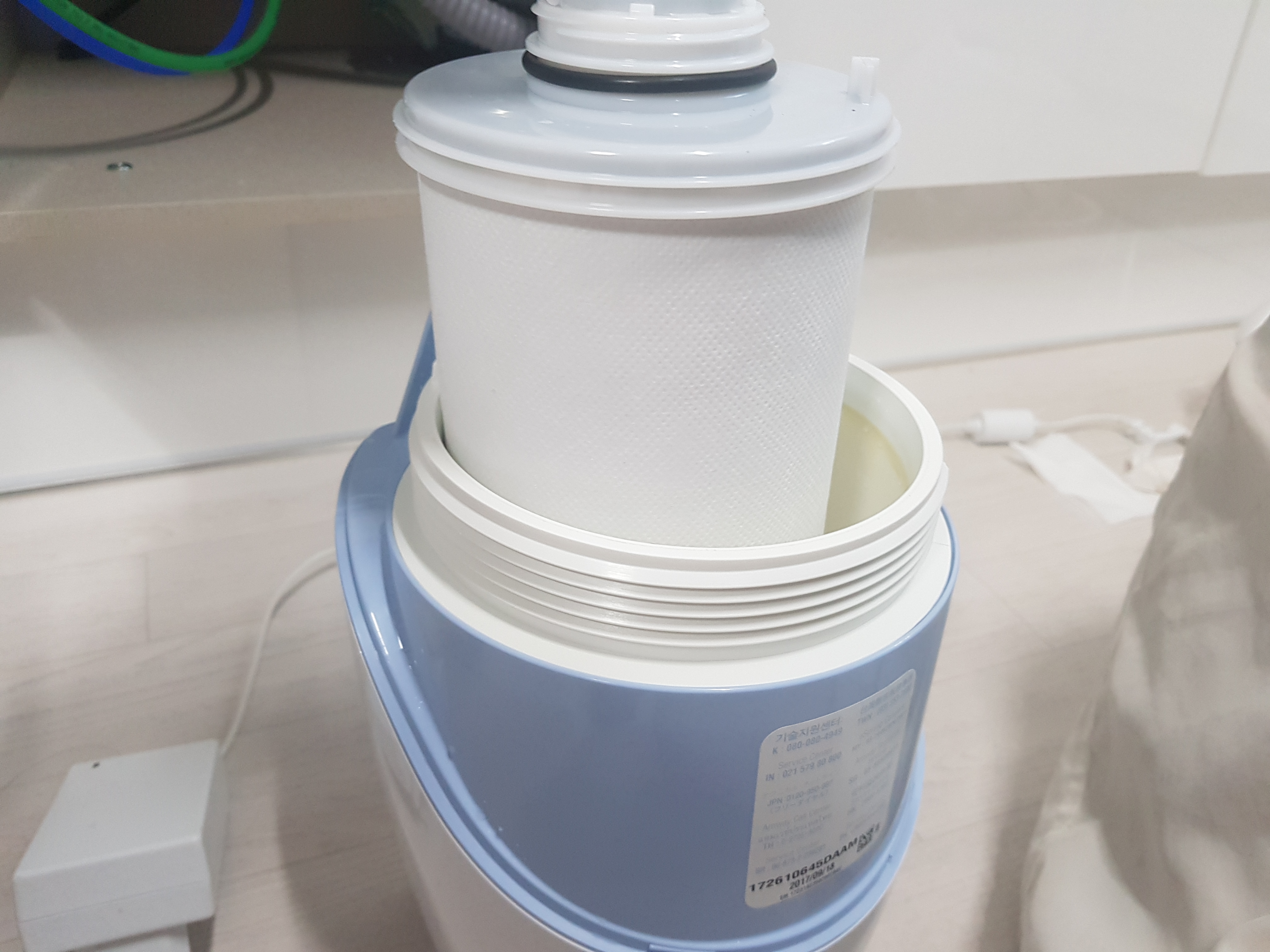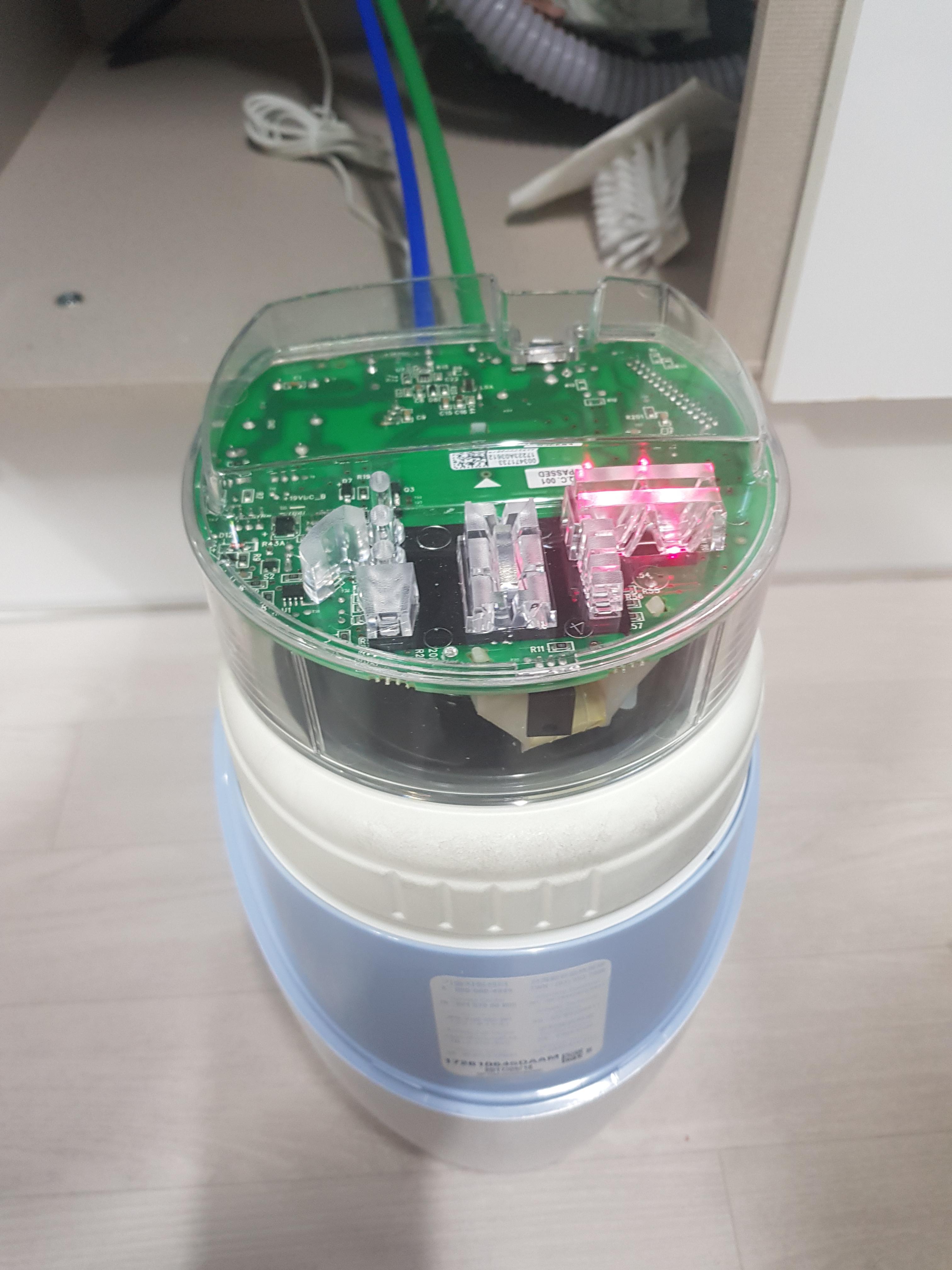 사실 필터 교체시기가 살짝 지나서 빨간불이 들어온지가 어느정도 기간이 지나버림..ㅋㅋ 삐삐 소리가 계속 나서 전원 코드를 뽑고 정수기와 연결된 호스를 잠근 다음 물이 멈추면 교체작업 시작.(확실히 안전한 확인을 위해서 정수기 물을 틀어보면 물이 나오지 않음)