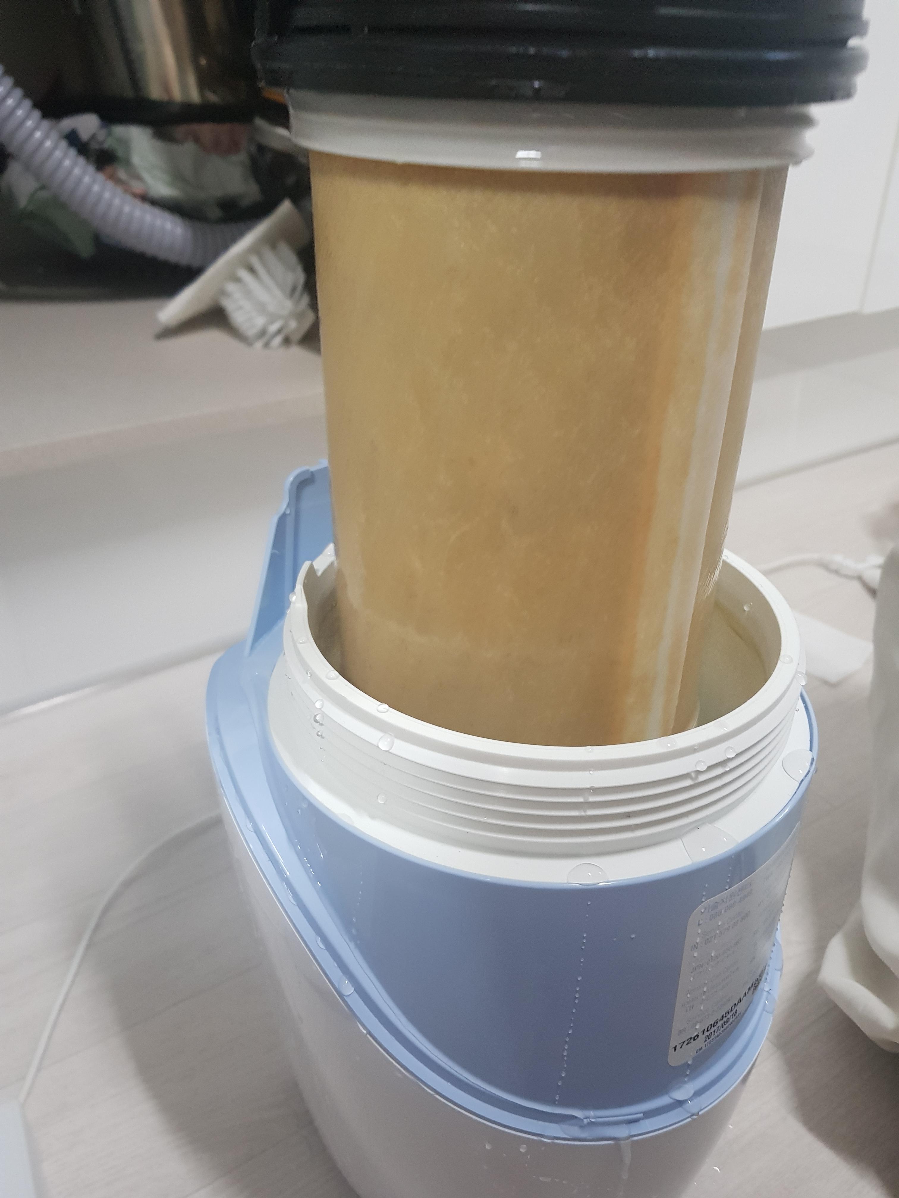 이때 물이 살짝은 나올수 있음. 열일했네 필터야... 노랗게 불태웠구나.. 옛필터를 들어내고 몸체를 들고 가볍게 안을 세척해줘야함.