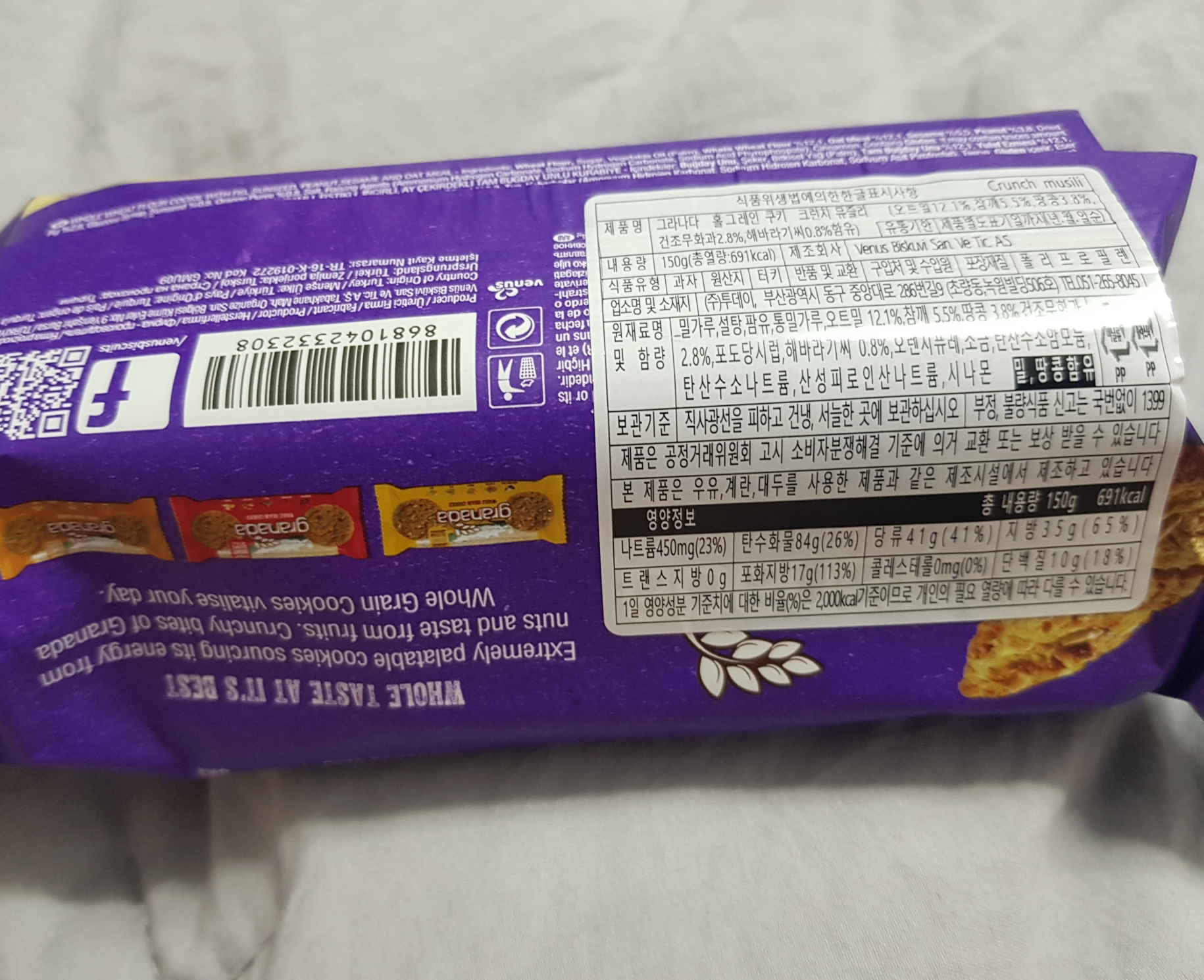 천원 치고는 괜찮다 싶어보였던 그라나다 홀그레인 쿠키 크런치 뮤즐리 여러가지 견과류가 들어가서 건강에도 그래도 좋을거같아서 ㅋㅋ구매해봄.ㅋㅋ 맛은뭐 나쁘지않았다 천원에 몸에좋은 견과들 들어가있는 쿠키니까..ㅋㅋ 어차피 쿠키는 몸에 좋을리가 없는데 그나마 곡물 들어가있으니 덜해롭고 그나마 몸에 좋겠지 라는 위안.ㅋㅋ 그래도 천원인데 진짜 착하다.. ㅋㅋㅋㅋ