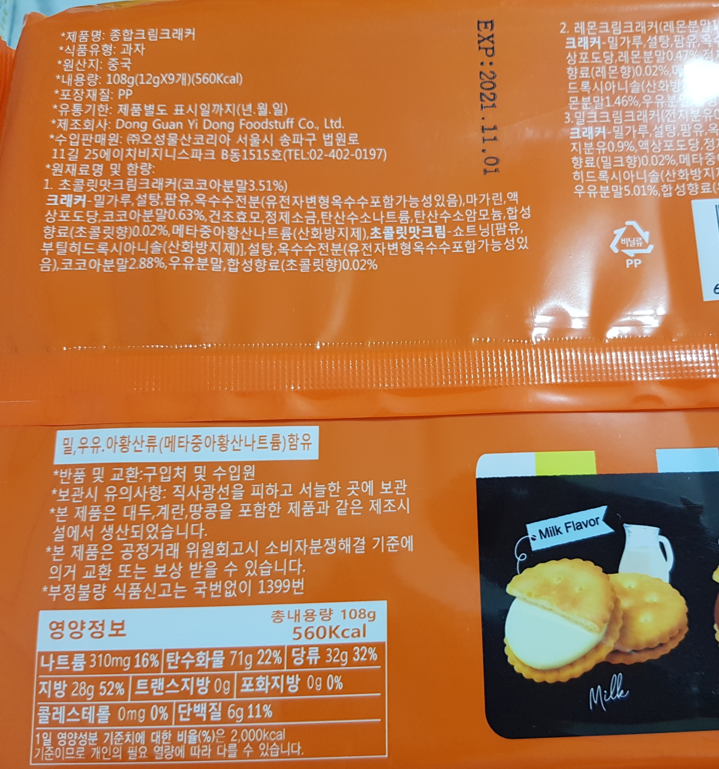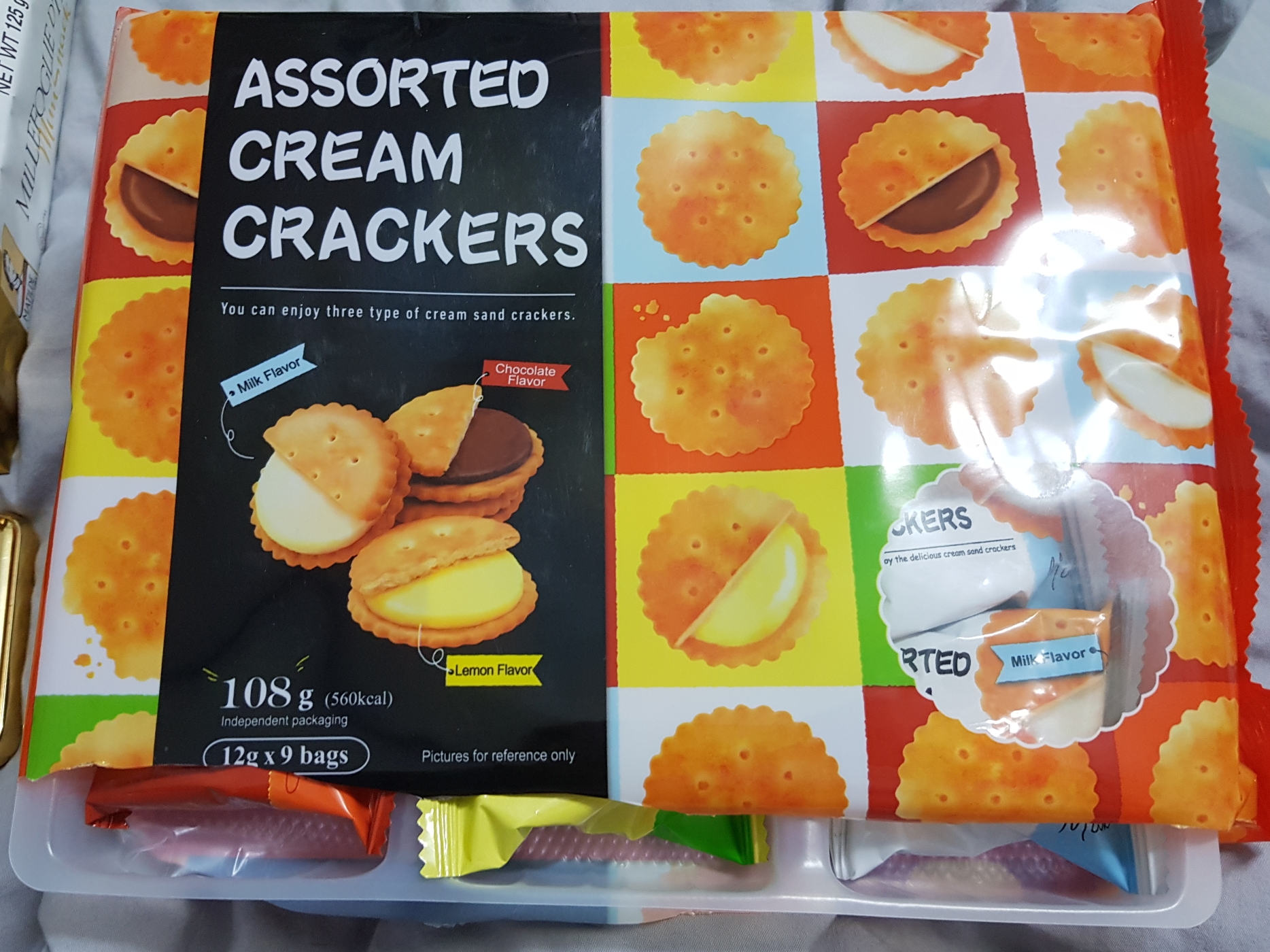얘도 천원인데 종합 크림크래커 라고 적혀있고 칼로리는 560칼로리 ㅋㅋㅋ 영양정보 확인하시공.. 세가지맛 크림이 들어있는 크래커.