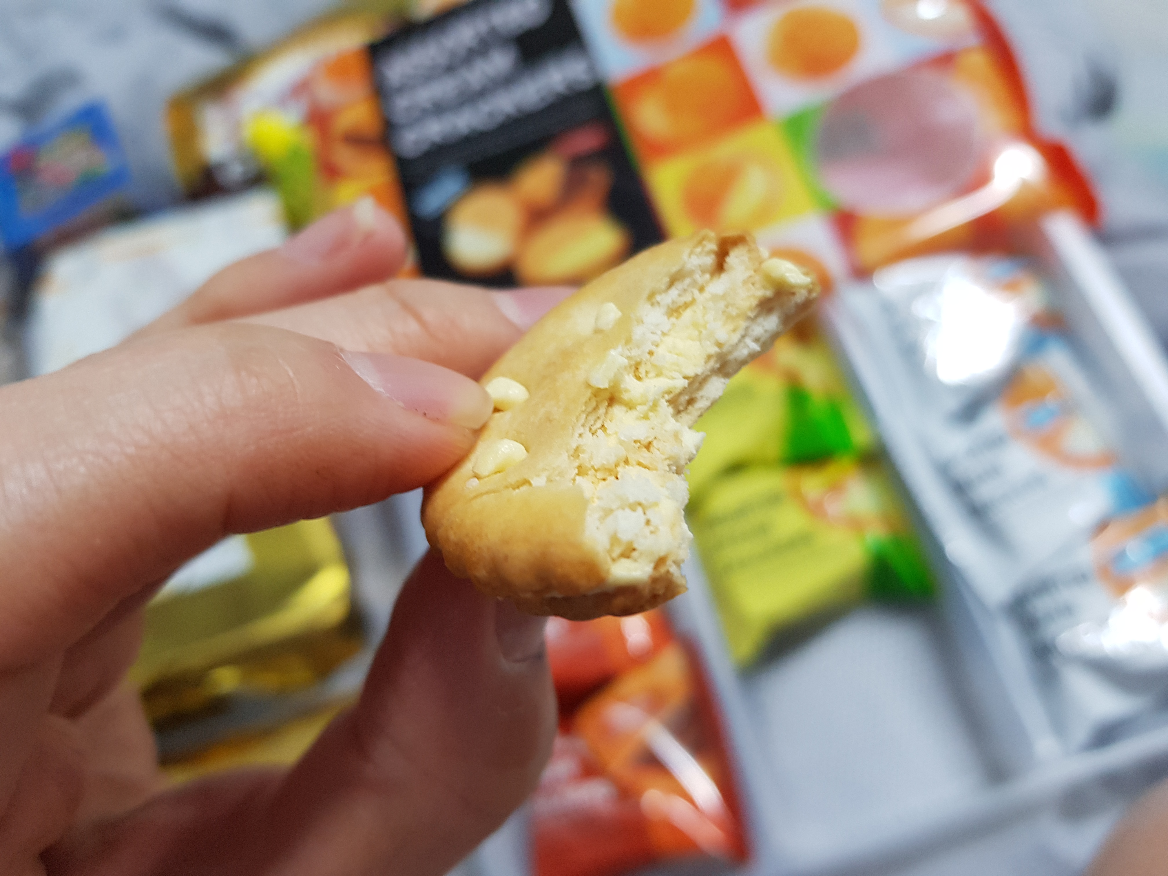 하나 뜯어서 손위에 올려봄. 사이즈가 마니미니하고 크림은 뭔가 잔뜩 들어있다는 어필을 하듯 삐져나와있음.ㅋㅋㅋ 레몬맛 합격!ㅋㅋㅋㅋ