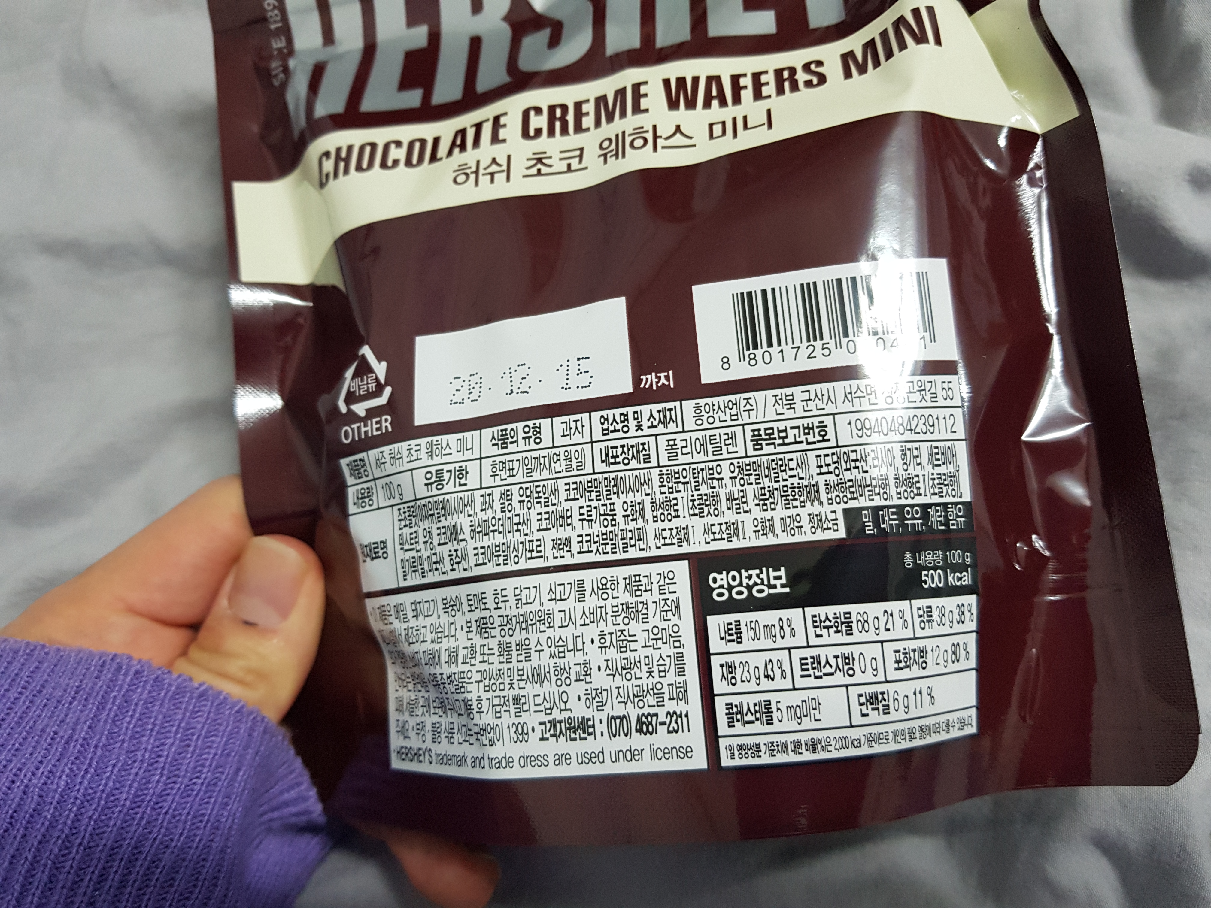 보기에도 맛있게 생긴 허쉬초코 웨하스 미니 가격은 이천원. 칼로리는 500 ㅋㅋㅋㅋㅋ 근데 서주에서 나왔네? 의외로 놀람 ㅋㅋ