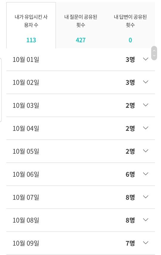 공유 내역을 보면 내가 궁금했던 질문을 누군가가 궁금해서 유입된 부분, 내 질문이 공유된 부분이 체크되어있음. 물론 나는 답변은 하지않았으므로 당연히 0이겠징..ㅋㅋㅋ