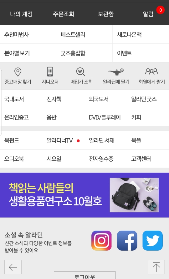 대표적으로 알라딘 앱이랑 yes24앱이 있는데 그 중에 알라딘 앱으로 공유해봄. yes24도 방법은 동일하다. 알라딘앱을 깔고 회원가입을 해준다. 요즘은 네이버 아이디로 쉽게 가입이 가능해서 가입하고 주소입력만 추가로 해주면 완성!