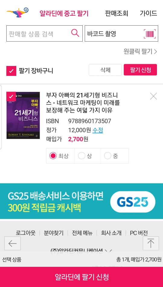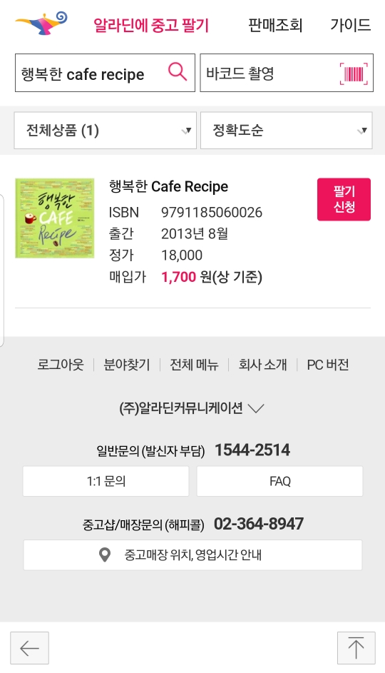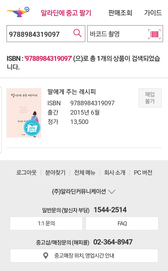 도서제목을 입력해도 되고 핸드폰 카메라로 책 뒷면에 바코드를 촬영하면 자동으로 뜨게된다. 첫번째 책을 바코드 촬영해봤는데 매입불가..또르르....