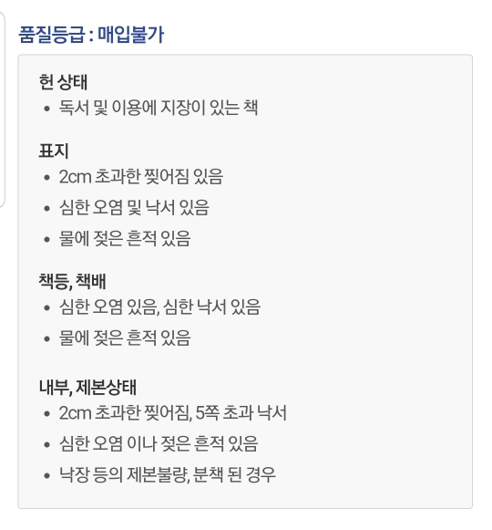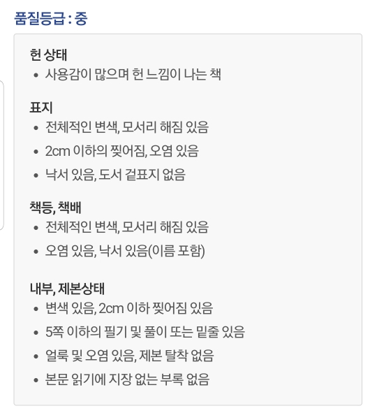 중은 헌책느낌이 나는 상태 (2cm이하 찢어짐 5쪽이하 필기등..)/ 매입불가 - 나머지 누가봐도 심한 헌책...은 그냥 판매하지 않는게 낫다..ㅋㅋㅋ