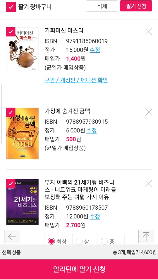 일단 여러개 찍어 봤는데 생각보다 나쁘지 않은 금액이 나왔다. 너무 기대를 안해서 그럴지도 모르겠지만. 어차피 처분해야하거나 버려야 될 책이라면 커피값이라도 버는게 낫지...암암..ㅋㅋㅋㅋㅋㅋ