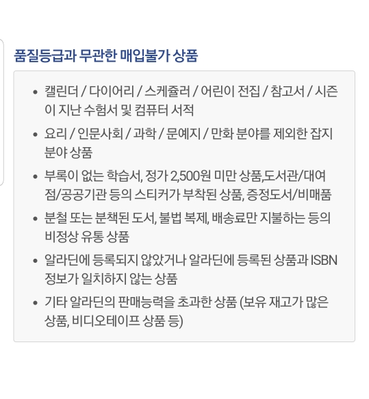 매입불가 상품도 참고하면 좋을것 같다. 중고책 판매 어플이 두가지라 혹시몰라 나머지 yes24까지 설치해서 알라딘에서 매입 불가한 책을 바코드 스캔해보니 실제로 매입가능한 책도 있고 가격이 좀더 높게 책정되는 책도 있었다. 가장 좋은방법은 둘중에 높은 가격을 분류해서 보내는게 가장 좋은방법!!ㅋㅋㅋ 이상 중고책 팔기 쉽고 편하게 알라딘 앱 yes24앱 으로 이삿짐 책 처분 중고책 인터넷 온라인 판매 방법 헌책 매입하는곳 포스팅을 마칩니다.
