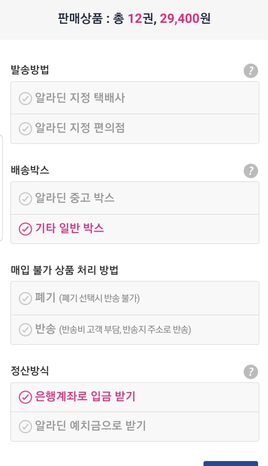 이렇게 판매할 책 리스트를 완료하고 나면 다음으로 발송방법과 배송박스 매입불가 상품 처리방법 정산방식 등이 나오는데 상황에 맞게 선택을 해준다. 보통 지정 택배사로 하고, 일반박스, 폐기, 은행계좌로 많이한다. 매입불가 상품이 나왔을 경우 다시 반송받으면 배송비가 또 들기때문에..ㅋㅋㅋㅋ