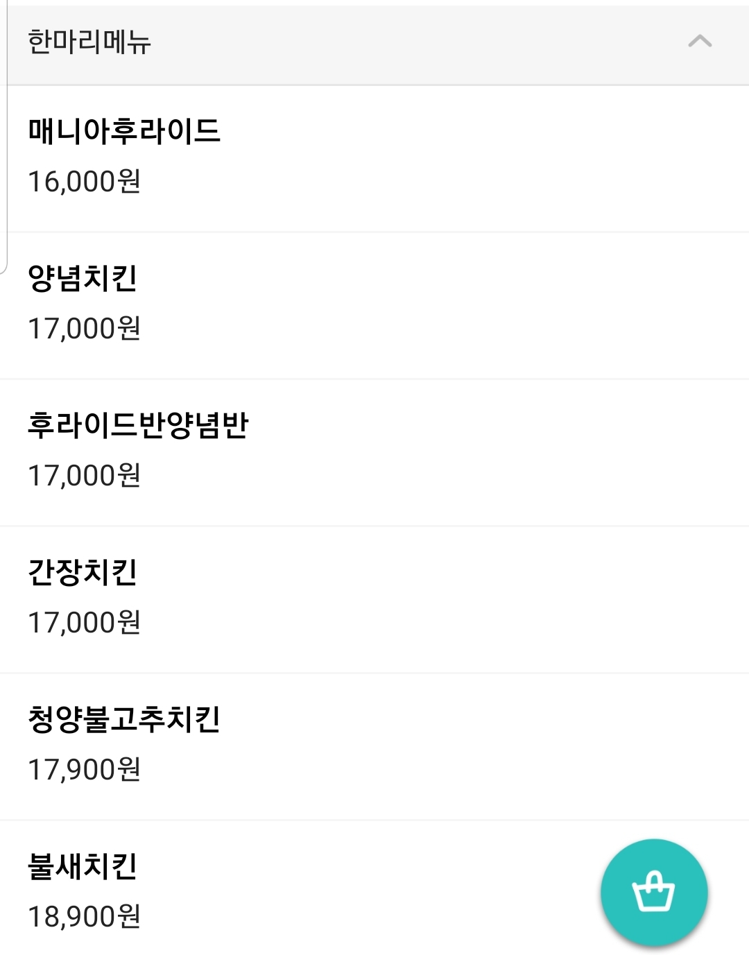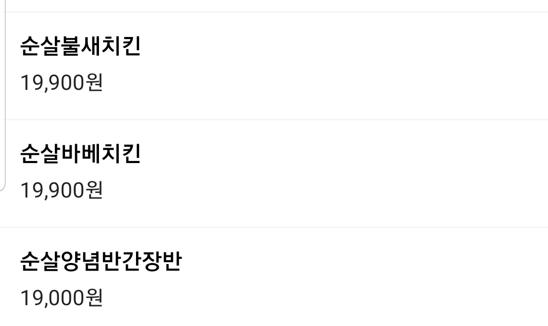 그리고 한마리메뉴에 바베치킨 18,900원 / 양념반간장반 18,000