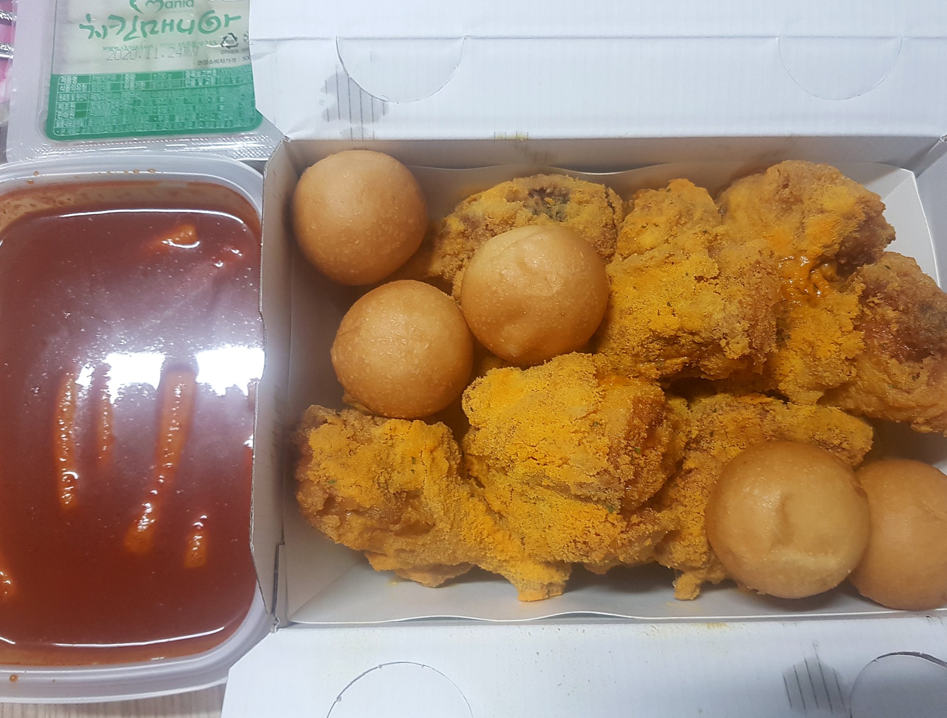 얘는 레게노 1단 허니치킨(날개,다리)와 맵떡이지만 추가요청사항에 덜맵게 부탁드리고 얜 치즈를 추가했음 ㅋㅋㅋ 비주얼 끝내주고요...ㅋㅋ