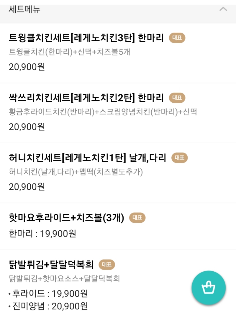 레게노 치킨세트의 가격은 20900원이며 치즈는 별도추가 허니치킨세트를 제외한 나머지는 신떡이 들어가고 맵기조절은 주문시에 부탁하면 조절해주심. 메뉴가격은 배달의 민족 메뉴판을 가져왔음.이번에 배달의 민족 가족껄로 다 첫주문 1만원할인받아서먹었으니까!ㅋ