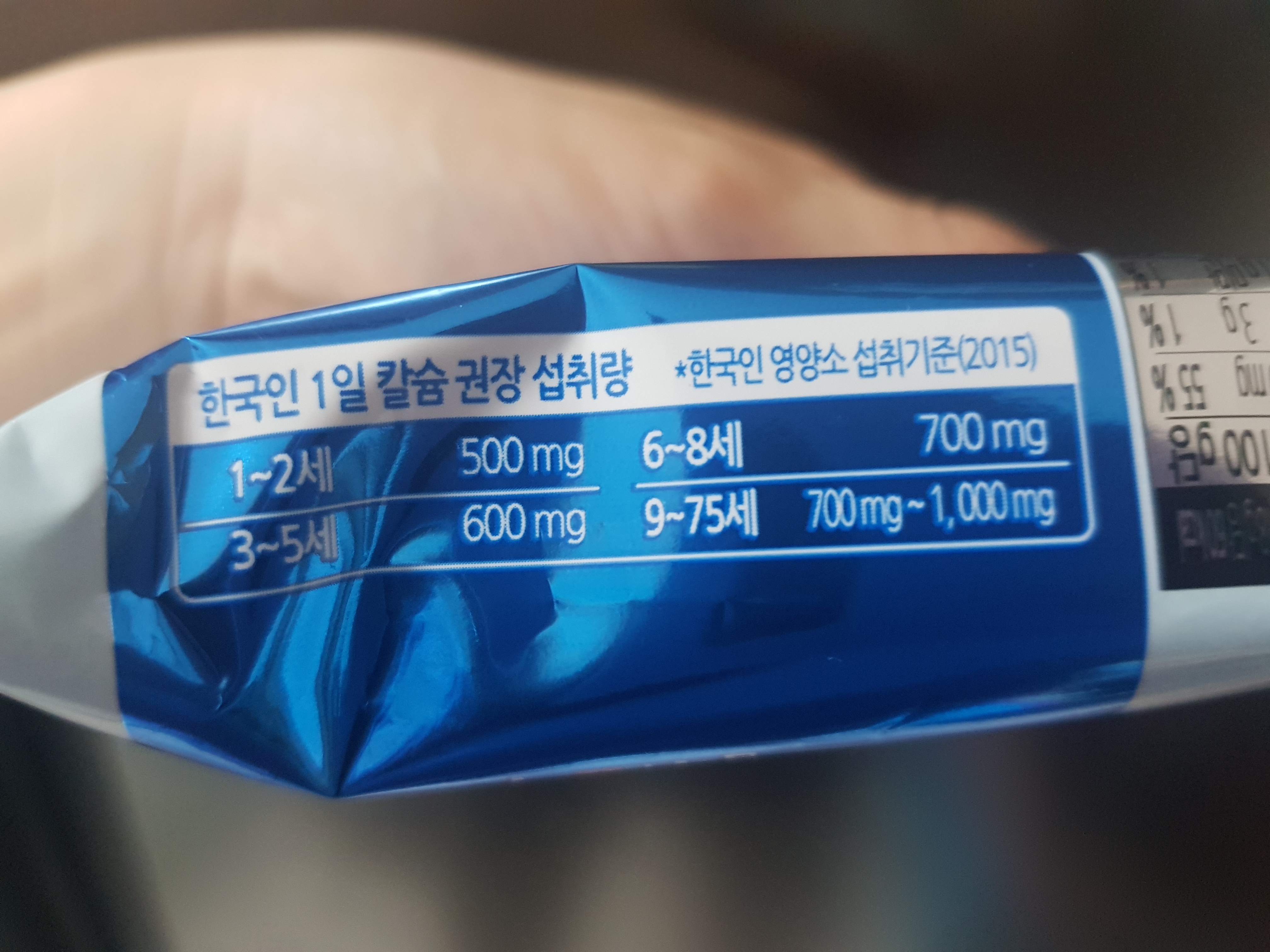 참고로 한국인 1일 칼슘권장 섭취량은 1-2세 500mg / 3-5세 600mg / 6-8세 700mg / 9-75세 700mg - 1000mg 이라고 함.