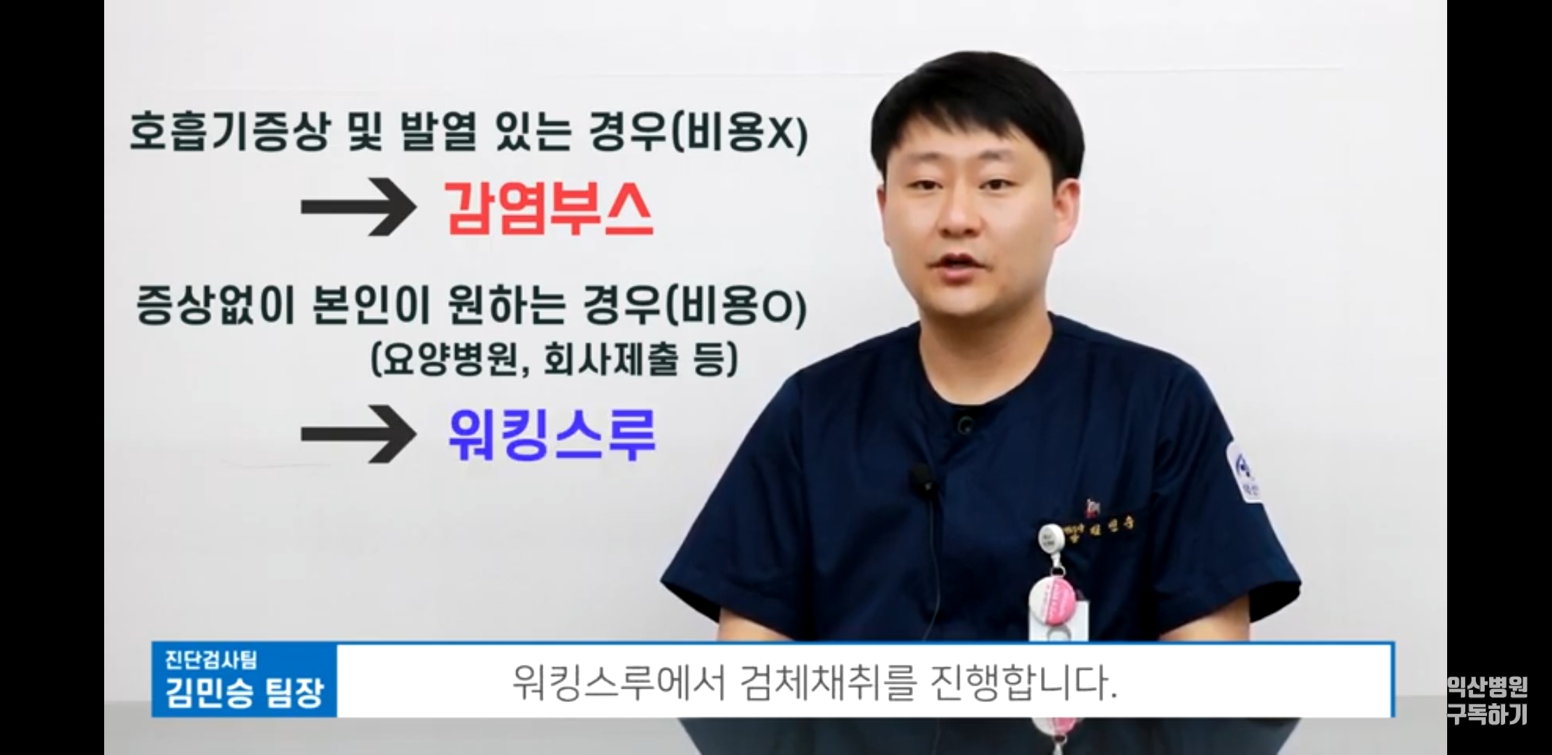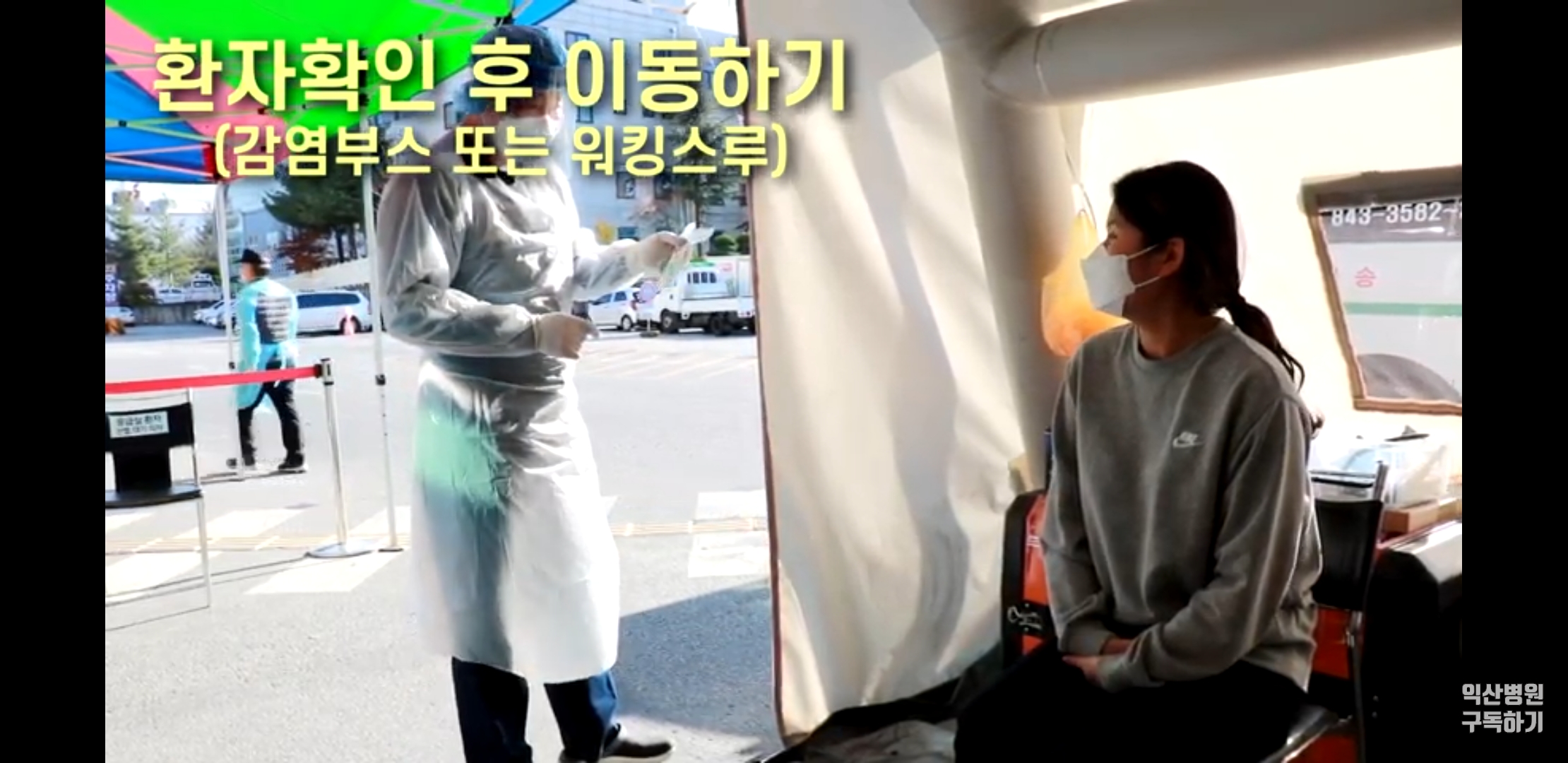 익산병원 채널에서 코로나 검사체취 과정을 상세하게 알려준 영상이 있어서 도움이 될것같아 영상 내용도 공유해본다. 우선 정확한 환자 확인후 호흡기 증상 및 발열 등이 있는 경우 또는 나처럼 보건소에서 문자를 받은 경우 따로 비용은 들지않고 감염부스에서 검체채취를 진행하고 증상이 없이 본인이 원해서 검사를 진행하는 경우 워킹스루에서 검체채취를 진행한다. 또한 해외 출국용 코로나 검사는 월요일 ~ 목요일 (공휴일 제외) 오후 2~4시에 접수및 검체채취를 진행하고 있다고 한다.