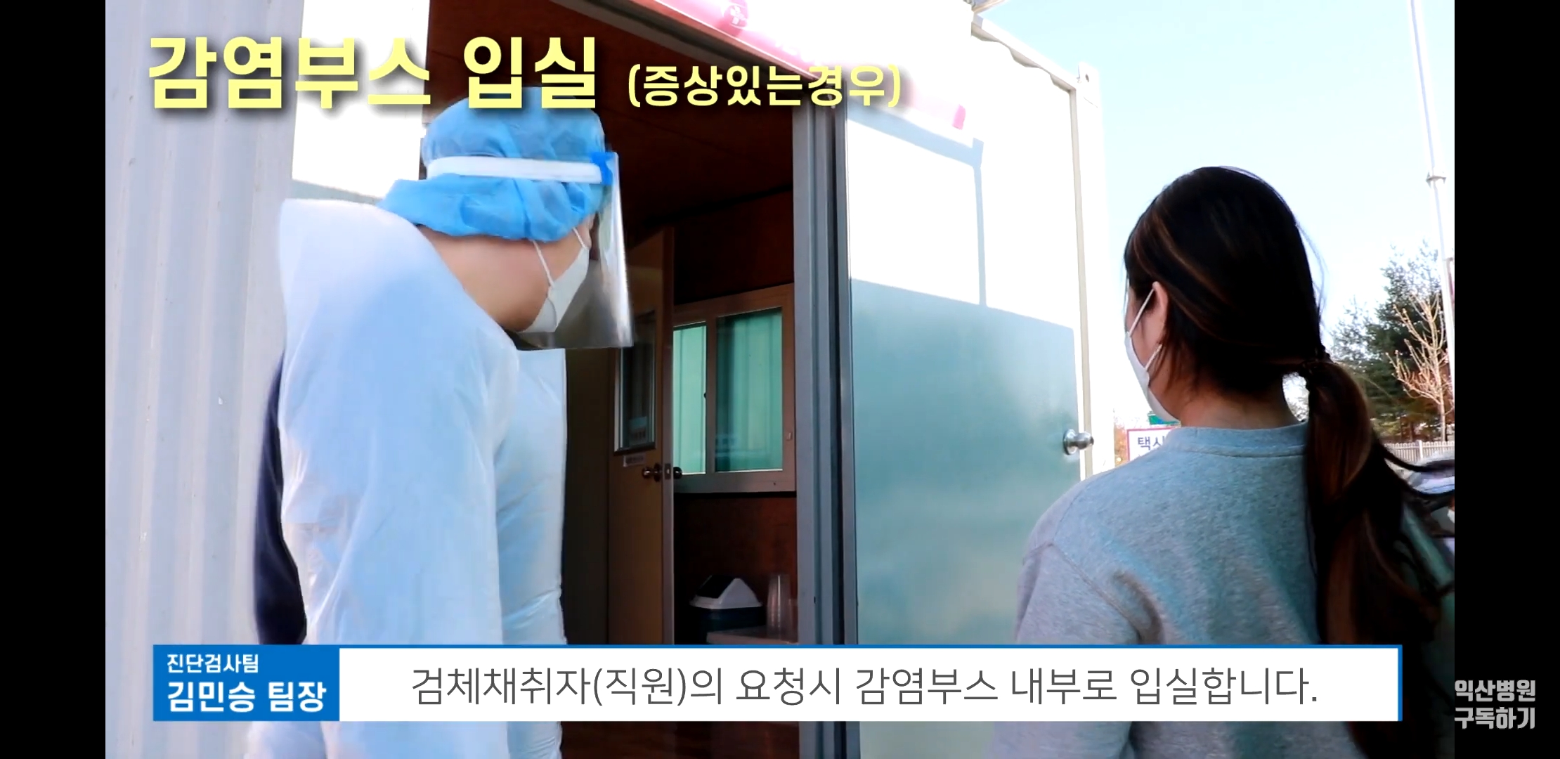 감염부스 컨테이너에 도착 후 환자및 보호자는 밖에서 대기하며 검체채취자의 요청시 감염부스 내부로 입실한다.