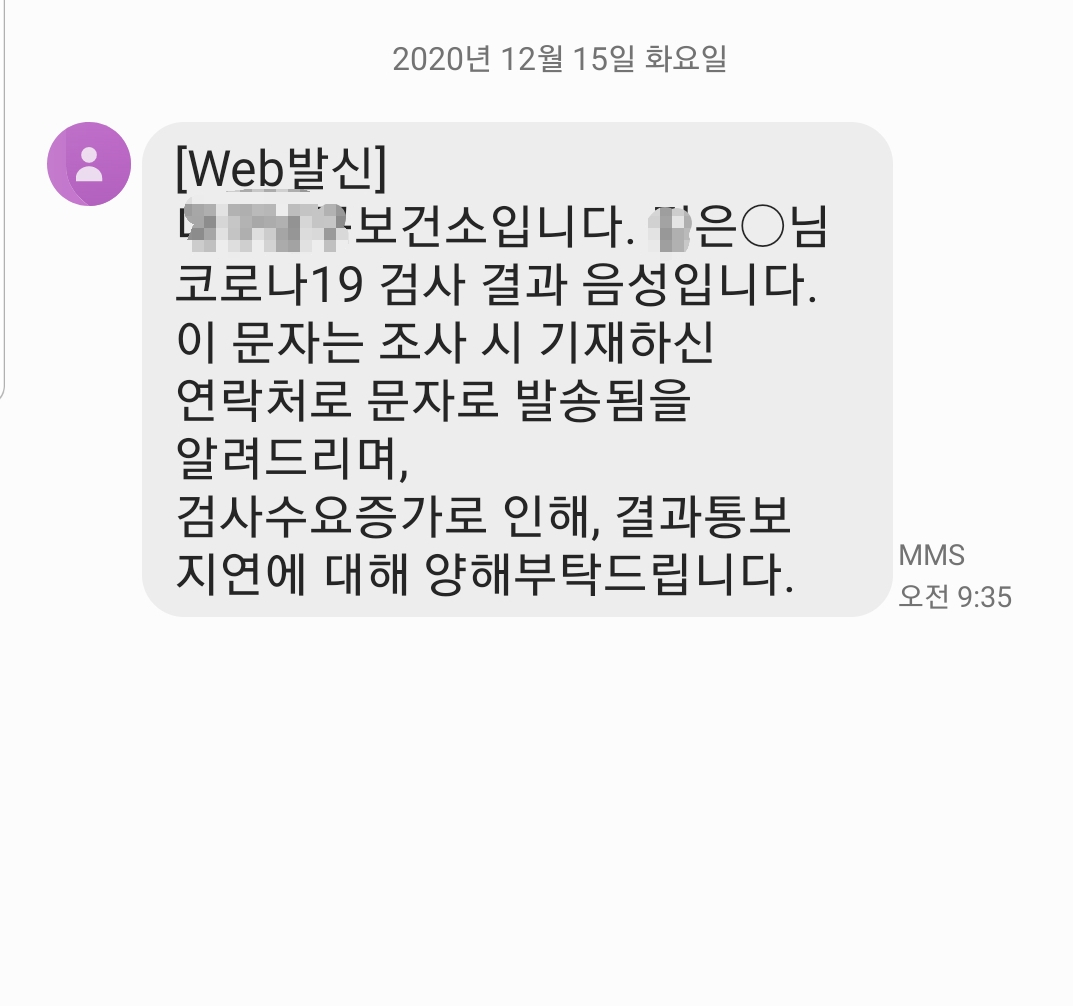 예약하고 바로 검사받아서 그런지 자고 일어나니 아침일찍 결과가 도착했다. 다행이다.. 3시에 검사해서 다음날 오전 9시 35분에 결과 통보받았음. 코로나가 음성일 경우 당일 저녁이나 다음날 아침에 문자통보가 오게되고 양성일 경우 의료진이 직접 전화로 연락이 온다고 한다.