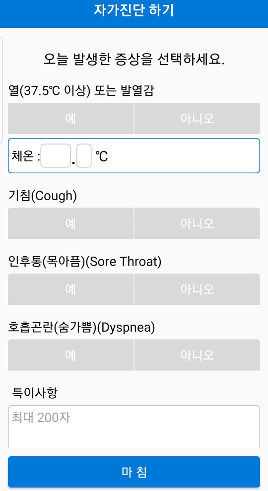 자가진단 키트에 들어있는 온도계를 겨드랑이에 끼고있다가...ㅋ빼서 온도를 확인하고 온도를 입력하면됨. 나머지 기침,인후통,호흡곤란등 특이사항이 있는경우에는 입력해주고 마침을 터치하면 전송완료