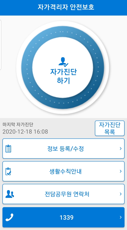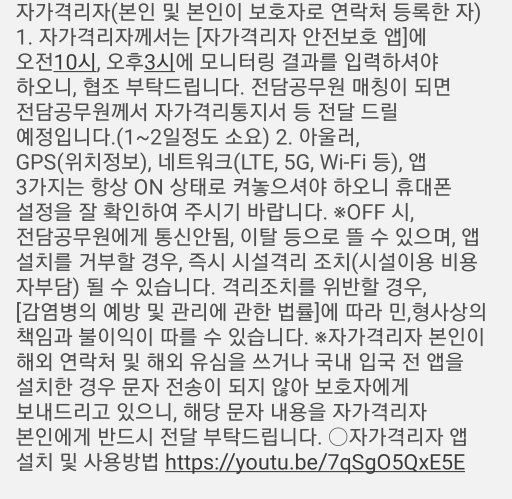 요즘 하루확진자가 엄청나게 늘어나고 있는 상황이라 보건소에서도 바로바로 진행이 어려워 자가격리 키트나 물품들을 전달하기까지 시간이 좀 걸릴수 있다고 들었고 미리 자가격리앱을 설치해라고 문자가 왔다. 앱을 설치하고 매일 오전10시 오후3시에 내 상태를 앱에 입력하고 전송해야하는 미션을 전달받음. 그리고 위치정보를 항상 켜두는것 필수.