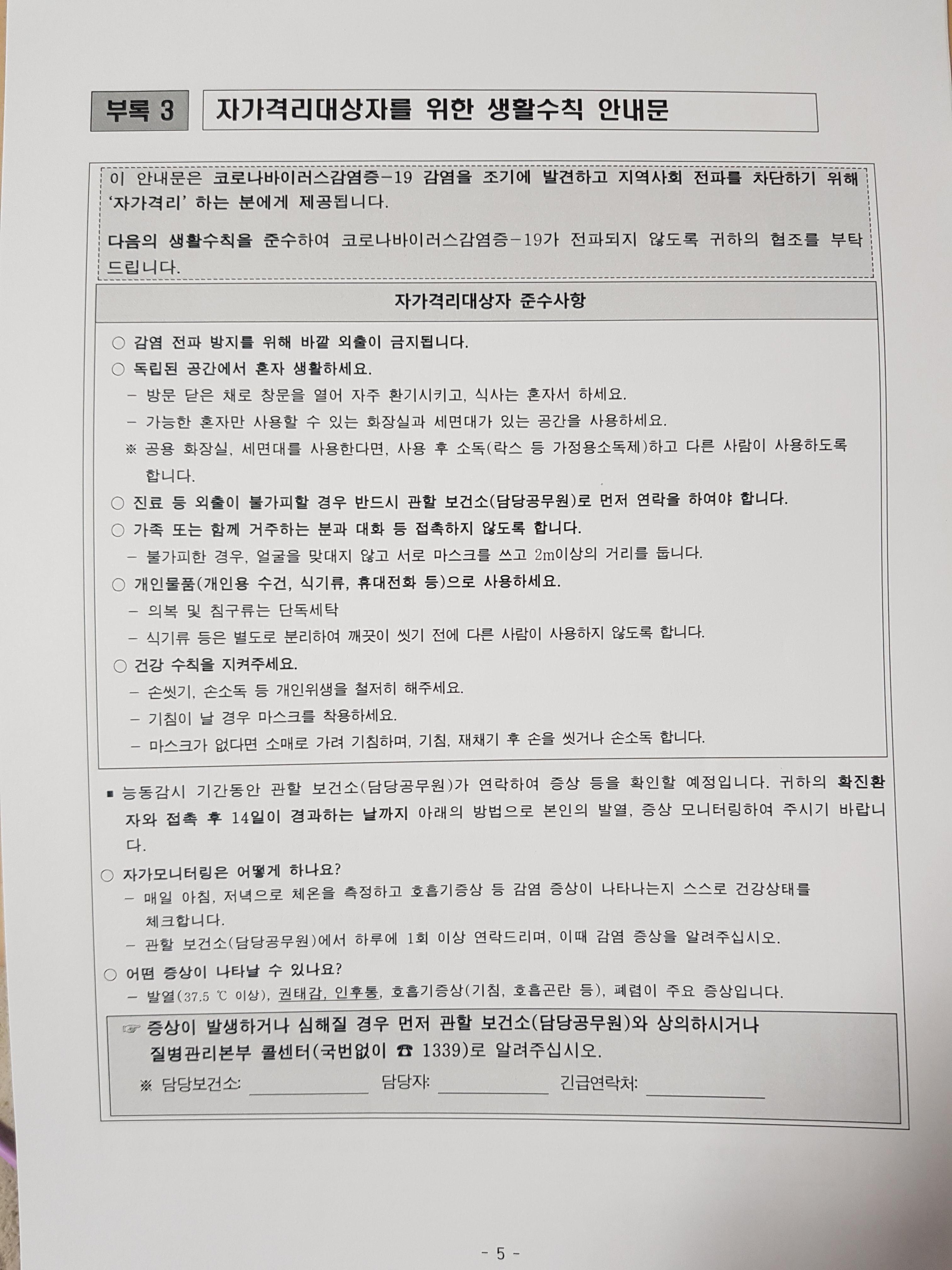 그리고 생활수칙 안내문 등이 들어있다. 별 증상 없이 잘 지나가기를... 이렇게 구호물품과 자가격리 키트를 확인했으니 자가진단앱을 살펴보자.