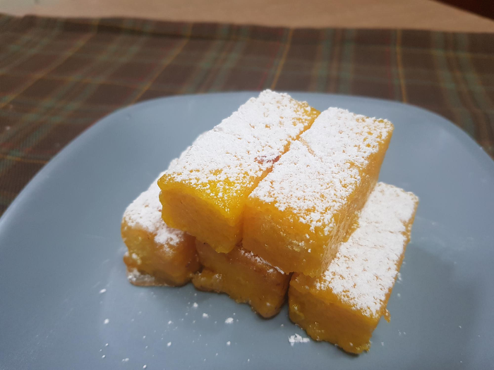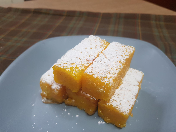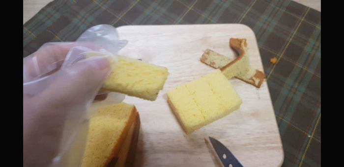 요즘 마트에서 카스테라 구하기가 쉽지 않아 두 번이나 실패하고 결국 파바에 가서 카스테라 하나를 집어왔다. 튀기듯? 하는 작업이 있으므로 카스테라의 또 하나의 맛을 담당하는 끝 부분을 과감히 날려준다.(난 저부분이 맛있던데ㅋ)
