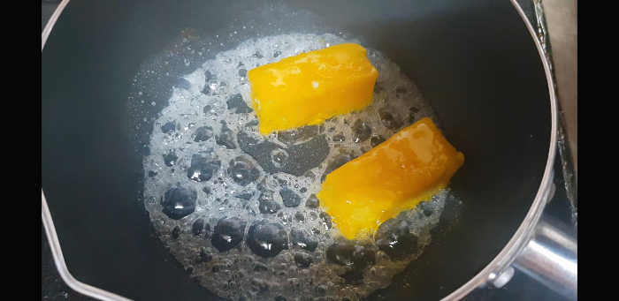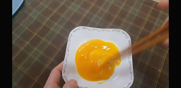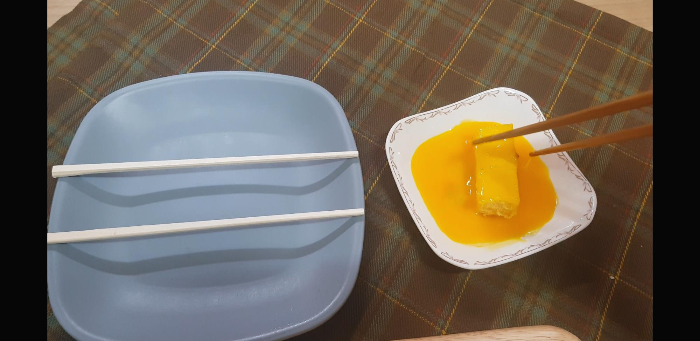 식힘망? 이 없는 나는 접시 위에 나무젓가락을 올려놓았다.(노른자에 적신 후 스며들게 3분? 정도 방치해야 하므로 바닥에 밀착 안되게)아까 손질해둔 카스테라를 노른자 위에 굴린다.여기서 1차 스트레스가 찾아온다. 카스테라는 그냥 젓가락으로 집어도 연약한데 계란물을 입히는 순간 무거워지며 젓가락질 또한 매우 조심해야 한다.살짝 세게 집었다가 모양이 찌그러지는 일이 발생.