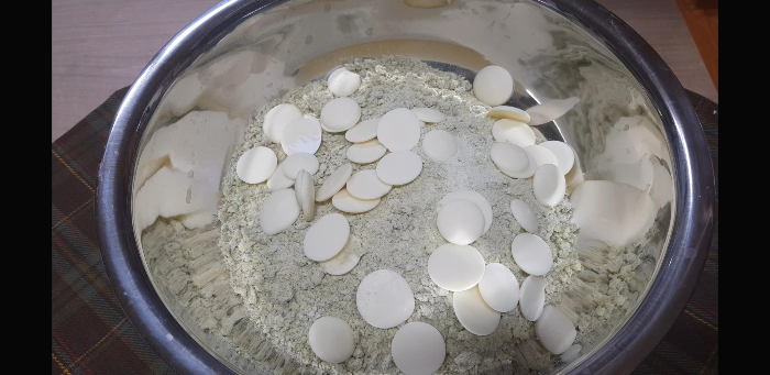 화이트 초콜릿110g을 넣어준다. 사실..큰 버튼형이라서 살짝 다져준다음 넣으면 제일 좋은데 귀찮아서 그냥 넣음..;;ㅋ(마트에 파는 일반 화이트 초콜렛도 상관없다 손으로 뚝뚝 잘게 부셔서 넣어주면 된다.)