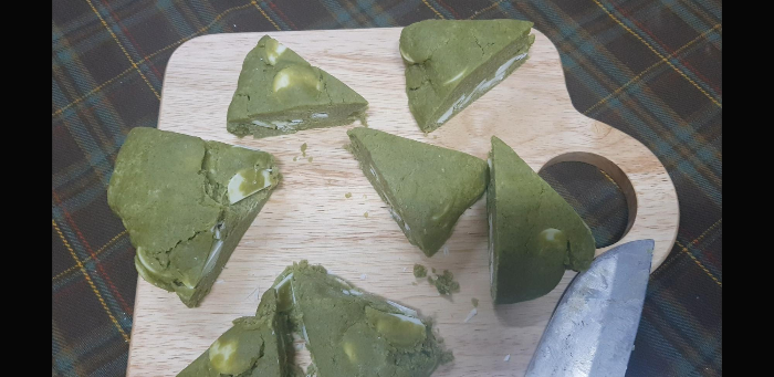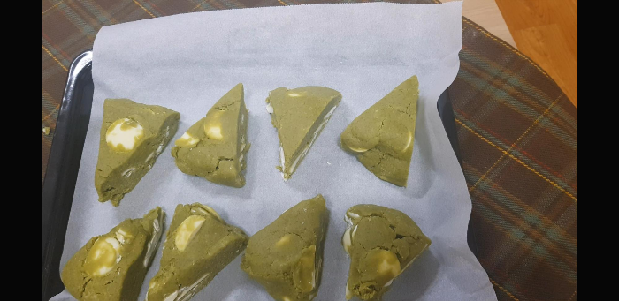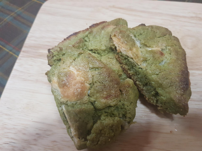 살짝 윗면이 색깔나게 구웠다. 마이쪙.. 녹차와 화이트 초콜렛의 조합이 너무 조합이 좋다.녹차스콘 검색해보면 알겠지만 대부분 비슷비슷함..ㅋㅋ예쁘지는 않지만 사랑스러운 녹차스콘 끄읕