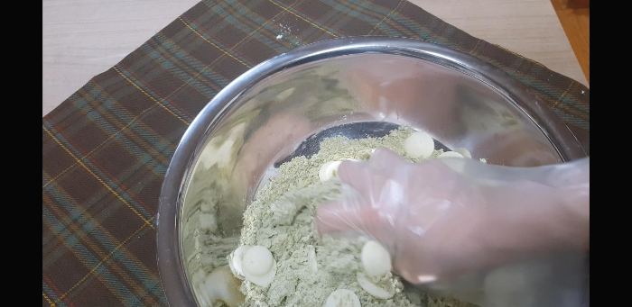 한시간후에 꺼내보면 포슬포슬 하던 가루들도 대충 넣은듯 하지만 뭉쳐져있다.이제 얘들을 꺼내서 도마위에 올리고