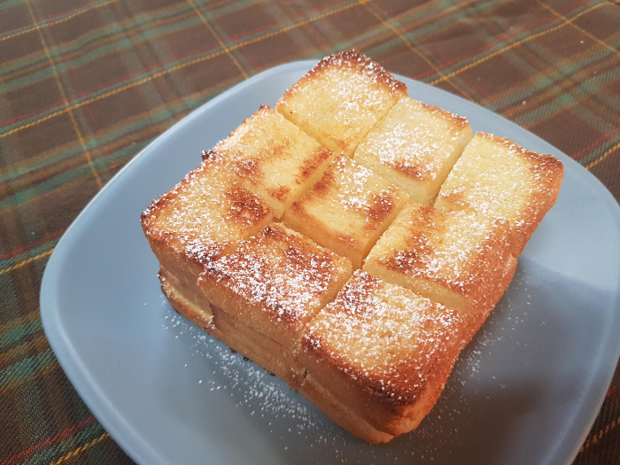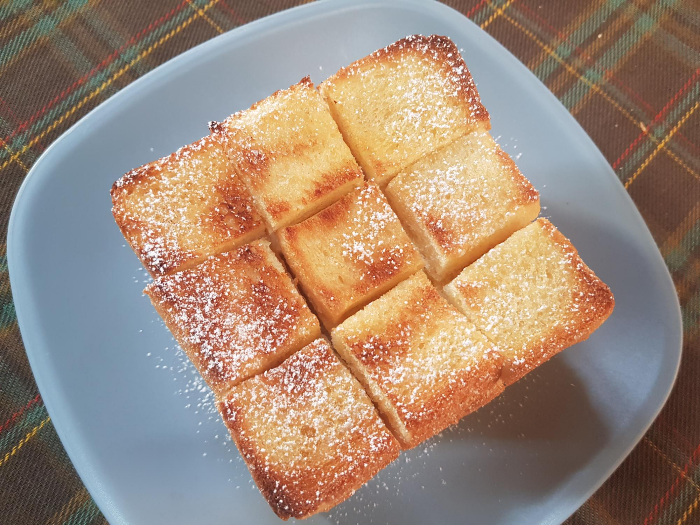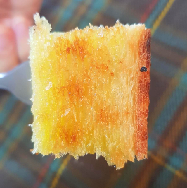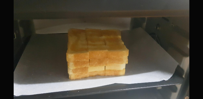 제일 밑바닥도 노릇노릇 맛이가 좋다. 간단한 허니브레드 만들기 성공적.완성된 다음에 식빵을 한장 들어서 보면 윗면 처럼 노릇하지 않고 처음처럼 부어준 버터가 그대로 있는듯한 착각을 불러 일으키는데 다된게 맞다.카페에서 허니브레드를 먹을때도 보면 윗면은 노릇한데 컷팅하면 안쪽은 버터가 스며든 그대로의 느낌이다. 가장 윗면과 가장 밑바닥은 직접적으로 열에 가까이 있는 부분이라 노릇하고 바삭하게 맛있고 그 중간 부분은 버터와설탕이 골고루 스며들어서 그나름대로 맛있다. 그리고 나이프가 필요 없이 포크로 한조각씩 먹을수 있어서 세상 편리한 허니브레드 만들기 성공적.