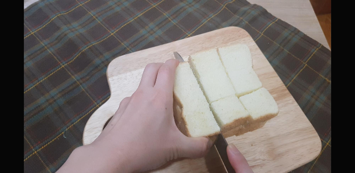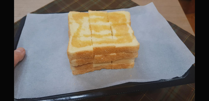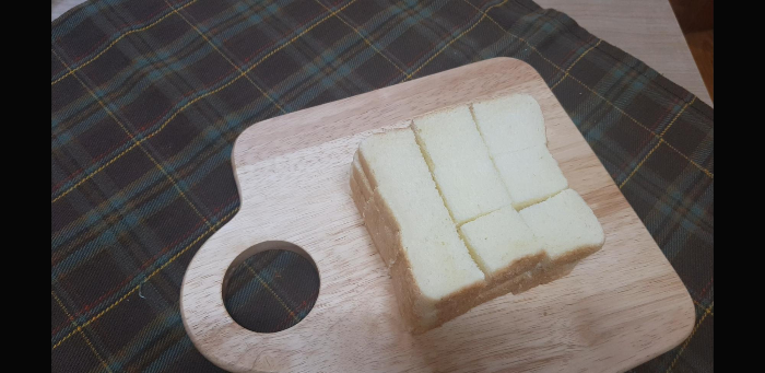 이제 식빵을 4층 쌓아놓고 9등분으로 컷팅해준다. 내가 사용한 식빵은 기린 토스트용 식빵이라 두껍지 않은데 도톰한 식빵은 3장해도 될듯.