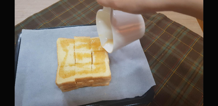 컷팅한 1장을 먼저 오븐팬위에 놓고 녹인버터설탕을 골고루 부어준다. 이때 180도로 오븐예열을 미리 하면 좋다. 식빵조각을 팬에 옮기는 과정이 약간?짜증을 유발할 수 있음 주의..
