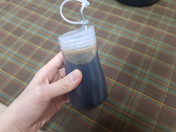 적당한 소스병에 담아서 냉장보관한다. 냉장보관을 하면 좀더 되직?해져서 시럽을 잔 벽으로 돌려가며 부어주면 카페에서 보던 그 비주얼이 가능하다.아무래도 당연히 에스프레소 원액이 들어간 시럽 만큼의 싱크로율 까지는 완벽하게 따라오진 못했으나 일반적으로 흑설탕과 일대일 비율로 가열하는 것 보다는 뭔가모르게 맛이 다르다.
