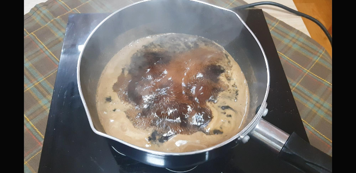 중불에 15분-20분 끓여주는데 나는 인덕션기준이라 너무 약한기포가 올라오는 정도가 아니라 어느정도 보글보글 정도면 괜찮음.15분정도 끓이고 추가적으로 필요에따라 끓여준다.일반적으로카페에서 판매하는 흑당시럽은 묽으면 흘러내리기 때문에 살짝?막이 생길 정도 까지도 괜찮았던것 같다.아주살짝.그리고 참고로 여기서도 저어줄 필요가 없다.