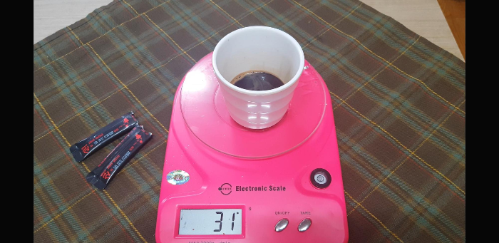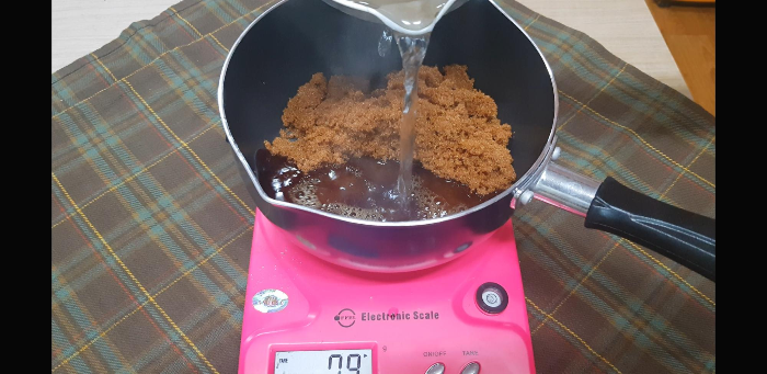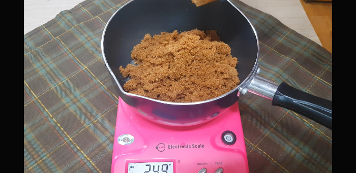 저울위에 냄비를 올리고 0을 맞춰준 다음 흑설탕 250g을 넣어준다.혹시라도 양이 많다 싶으면 120g정도에 카누스틱 1개만 사용해서 만들어 먹어본 후에 괜찮으면 더 만들어 먹어도 되니까 적은 양으로 먼저 해봐도 괜찮을것 같다. 설탕과 물의 비율은 1:1이며 가열하는 시간 정도만 조절해주면 될듯.