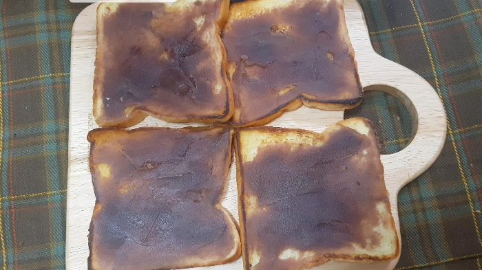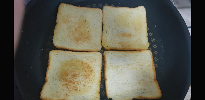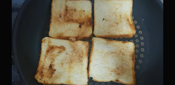 불을 좀 세게해서 하다보면 금방 양면 다 노릇하게 구워진다.구워진 식빵은 잠깐의 식힘이 필요해서 옮겨놓고 다음식빵을 구워주다보면 식어있다. (근데 해보니까 가장 바삭하게 되는 방식은 역시 불이꺼진 후라이팬 위에 계속두었던 식빵이 수분이 계속 날아가니까 바사삭.)