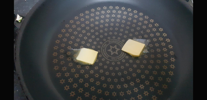 버터조각을 후라이팬 위에 올려준다. 이때 식빵에다 버터를 흥건하게 양쪽으로 뒤집어가며 묻힐 필요가 없다. 그렇게 되면 시간도 걸리고 바삭 보다는 살짝 눅눅에 가깝기 때문에 버터를 작게 잘라서 올려준다.