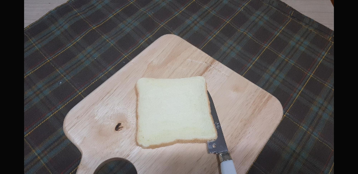 식빵 한장을 반으로 포를 뜬다.보기엔 엄청 어려워 보이는데 생각보다 어렵지 않다. 식빵이 단단한 편이라 우선 작은칼로 식빵을 돌려가며 선을 그어준다.나는 자주 해봐서 선 없이도 하는데 처음엔 이렇게 해주는게 좀더 쉽다.(할수있다 할수있다...)