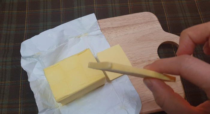 구워진 식빵이 식어가는 타임에 냉장고에서 버터를 꺼내서 잘라준다.버터를 미리 잘라놓으면 실온에서 점점 녹아가기 때문에 차가운 상태에서 바로 잘라서 사용하는게 좋다.어차피 구운 식빵자체도 열이 있기 때문에 가급적 바로 자르는걸 추천하고 토스트는 따뜻하고 버터는 차가워야 맛있는 조합
