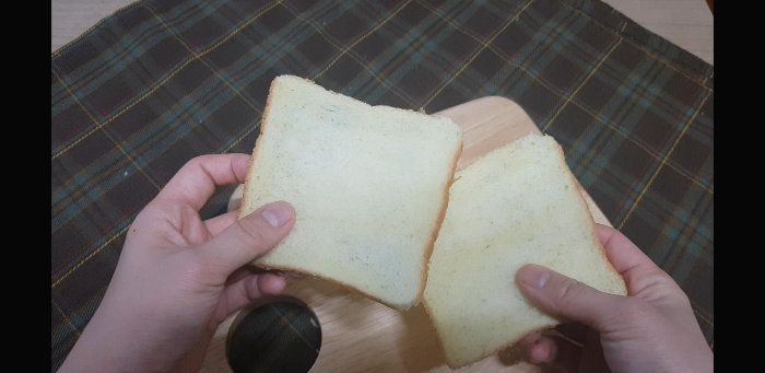 왜 얇으면서 많이 들어있는 식빵을 추천하느냐 하면 이 식빵이 다른 통통하고 상대적으로 큰 식빵보다 살짝?단단한 느낌이라서 만들기가 훨씬 쉽다. 좋은식빵을 써봤는데 결이 보들보들해서 반을 슬라이스 하기가 매우 어려워 냉동한 다음 해동해야하는 초 번거로움이 있으므로 얇으면서 단단한 느낌의 식빵을 추천한다.